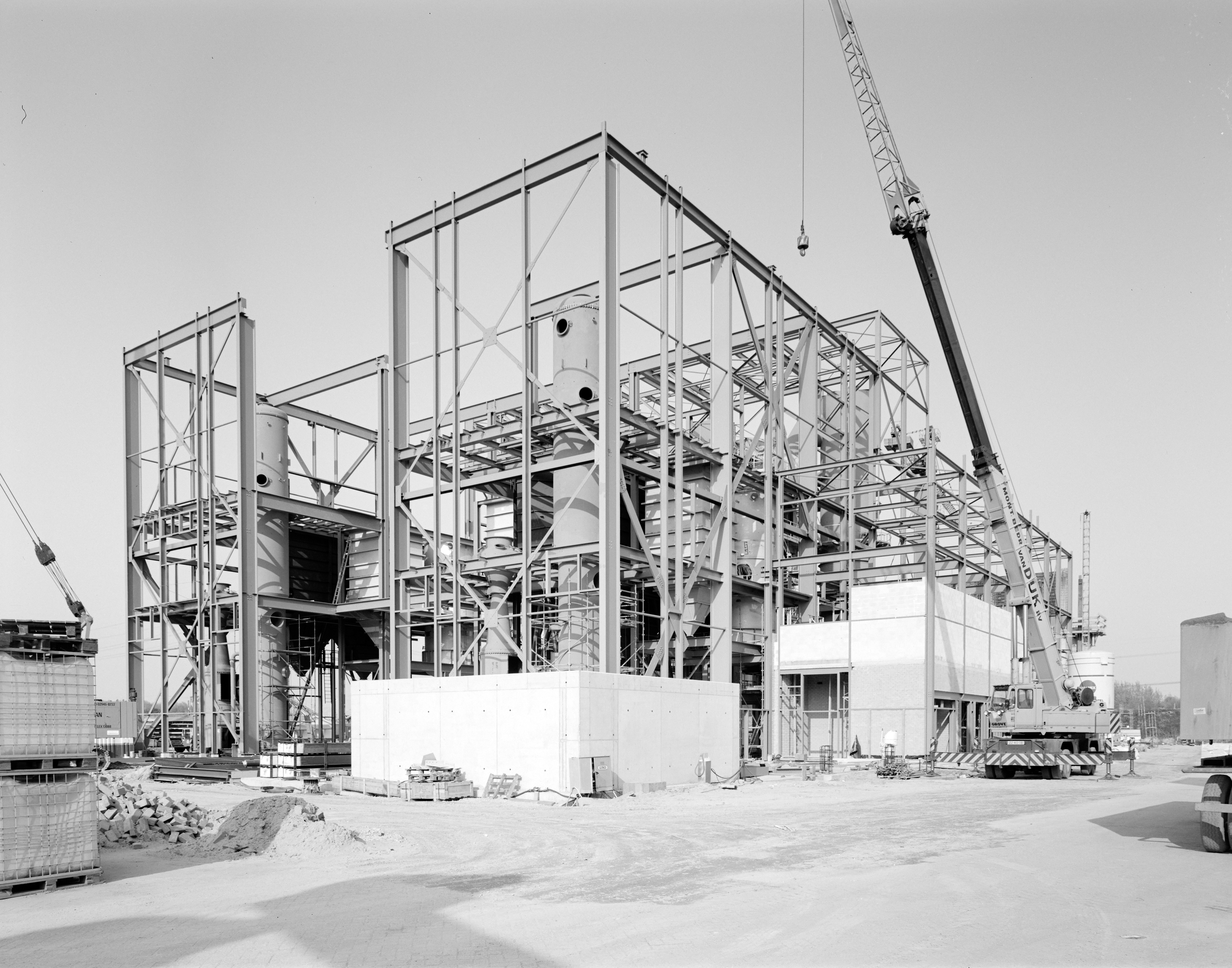 Op deze afbeelding zien we de bouw van de slibverbrandingsinstallatie (SVI) van de DRSH aan de Baanhoekweg 48. Bouwperiode 1992/1993. Eind 1993 is deze SVI in gebruik genomen. Tijdens de bouw zijn er veel foto’s gemaakt. Zie eventueel afbeeldingen: 1280-1216 t/m 1280-1256, 1280-30109 t/m 1280-30130 en 1280-30181 t/m 1280-302244. Zowel GEVUDO als DRSH behoren in 2022 al een aantal jaren tot de HVC groep.