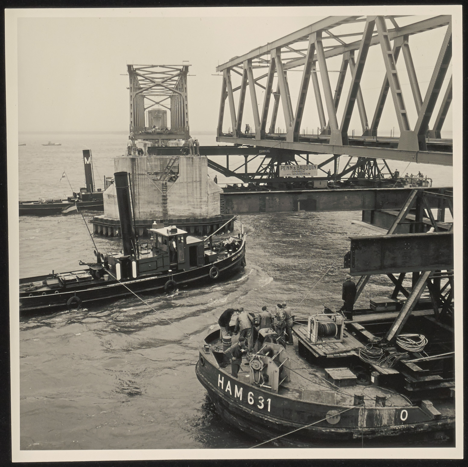 Het invaren van de tweede dubbelsporige overspanning van de spoorbrug Moerdijk over het Hollandsch Diep. Op de voorgrond een tijdelijke pijler die negen jaar eerder was gebouwd om een noodbrug te ondersteunen, geplaatst ter herstel van de oorlogsschade van WO2 aan de spoorbrug.