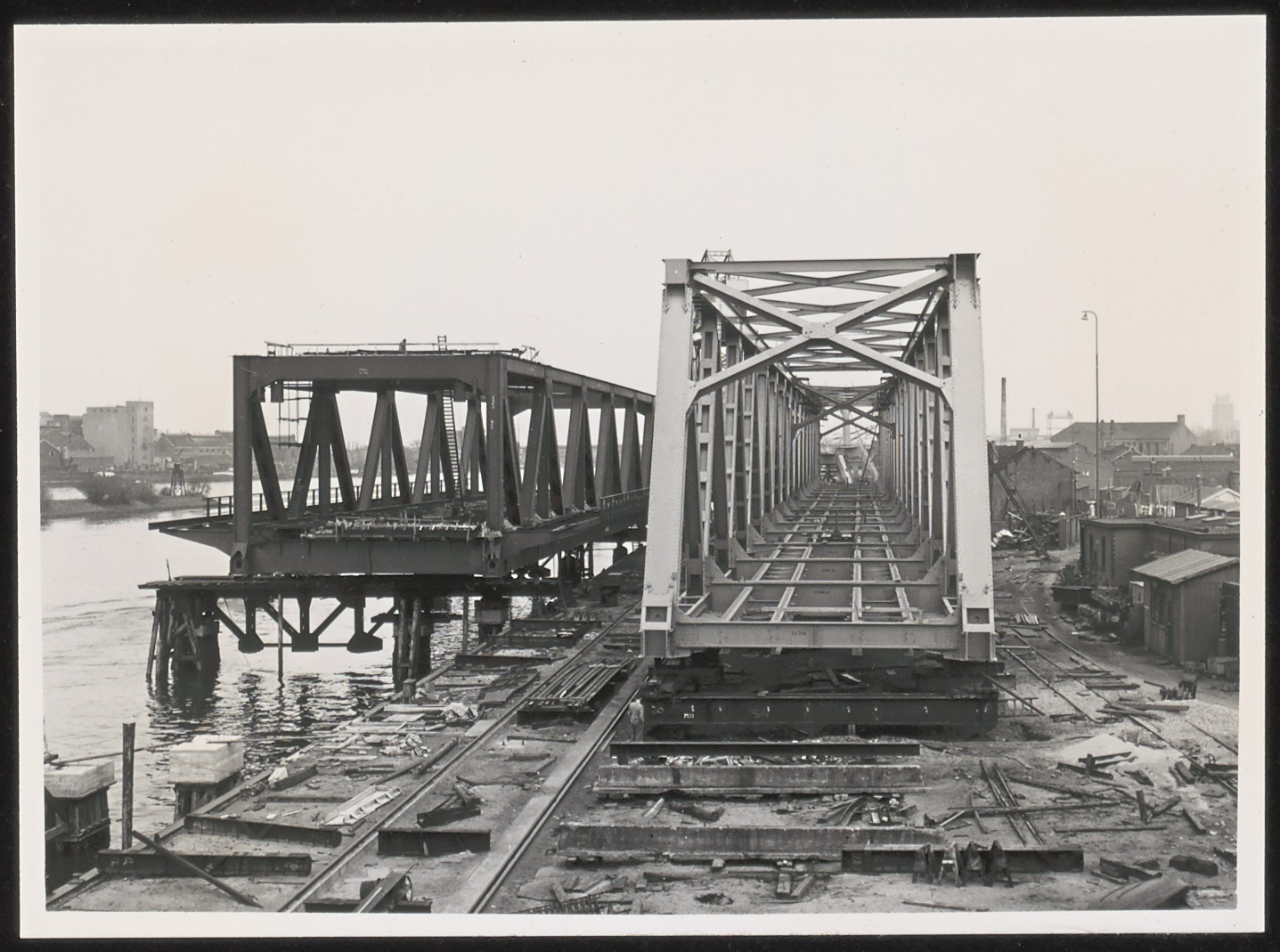 Links één van de twee vaste overspanningen van de Botlekbrug, praktisch afgebouwd. Rechts een dubbelsporige overspanning bestemd voor de Moerdijk spoorbrug, spoorverdubbeling door vervanging van de overspanningen in 1954 en 1955 . De tweede overspanning van de Botlekbrug is geplaatst 18 mei 1954. Datering van de opname zal dan 1954 zijn, in of voor mei.
