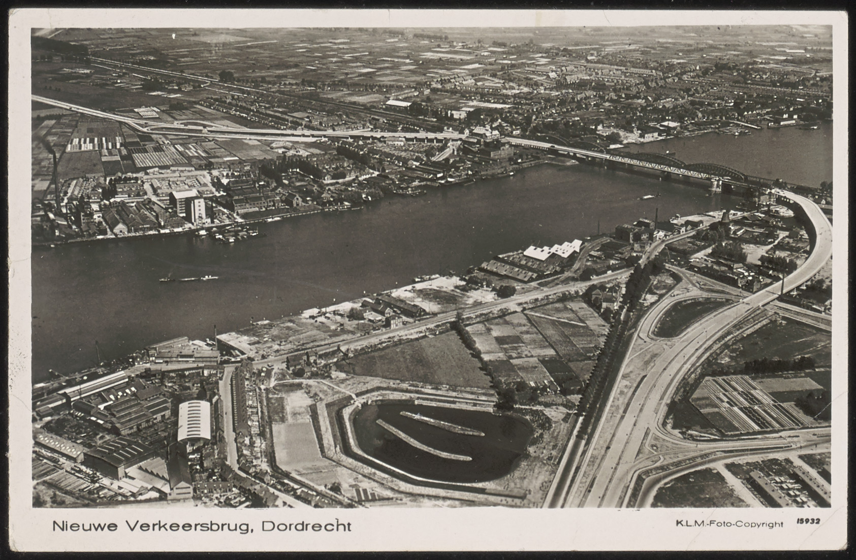 - Luchtfoto van de laatste fase van de bouw van de Zwijndrechtse Brug over de Oude Maas. In de linker onderhoek het bedrijfsterrein van Penn & Bauduin.