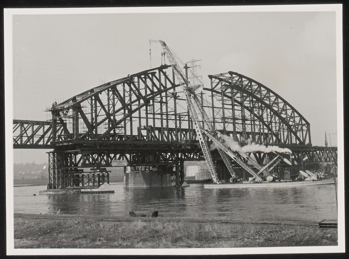 Constructie van de nieuwe dubbelsporige boogbrug over de Nederrijn bij Oosterbeek. De constructie is begonnen in maart-april 1950, naast de enkelsporige noodbrug die is geïnstalleerd na WO2. In het weekeinde van 10-11 mei 1952 zijn de laatste drie overspanningen van de noodbrug verwijderd en is de voltooide boogbrug op zijn definitieve plaats gezet.
