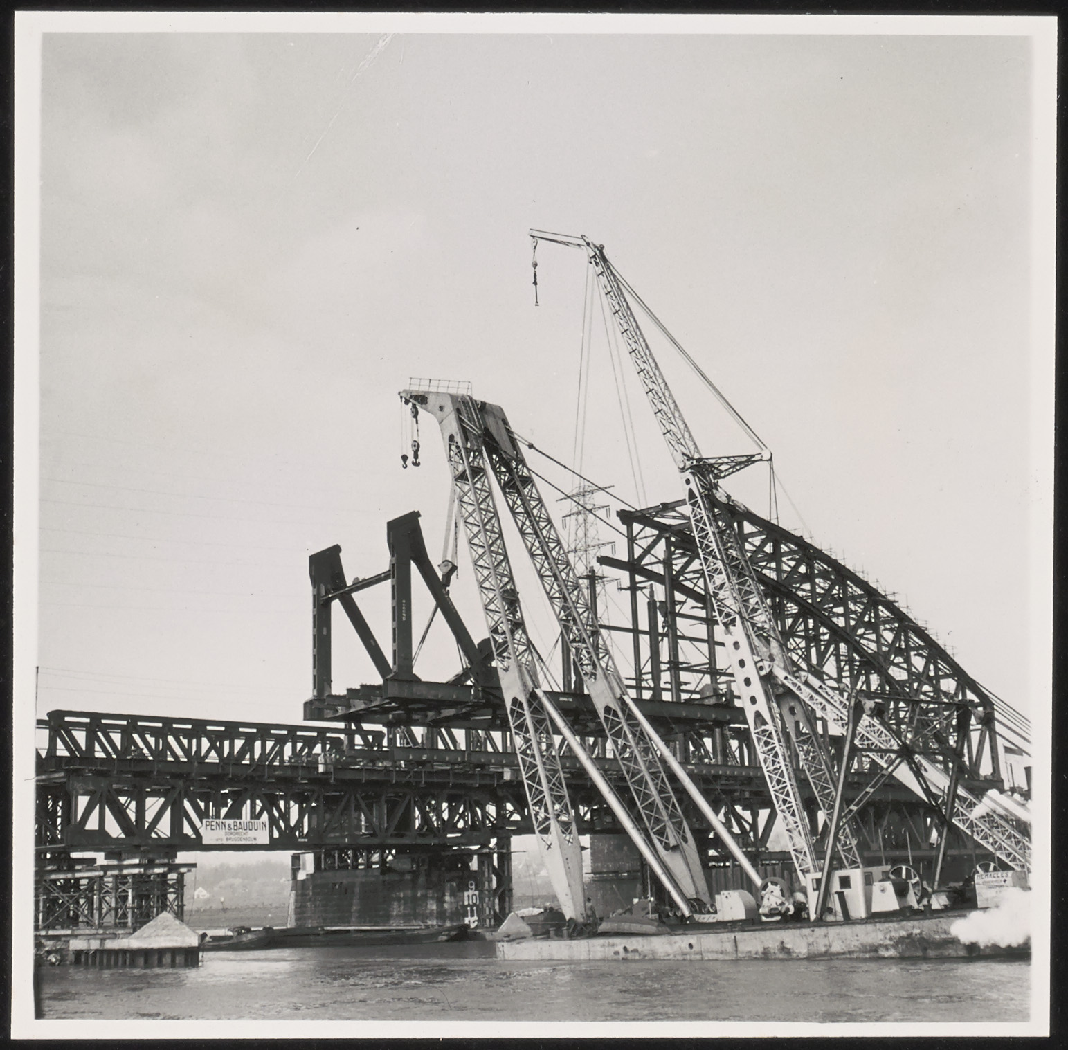 Constructie van de nieuwe dubbelsporige boogbrug over de Nederrijn bij Oosterbeek. De constructie van de boogbrug is begonnen in maart-april 1950, naast de enkelsporige noodbrug die is geïnstalleerd na WO2, hier links te zien. In het weekeinde van 10-11 mei 1952 zijn de laatste drie overspanningen van de noodbrug verwijderd en is de voltooide boogbrug op zijn definitieve plaats gezet.