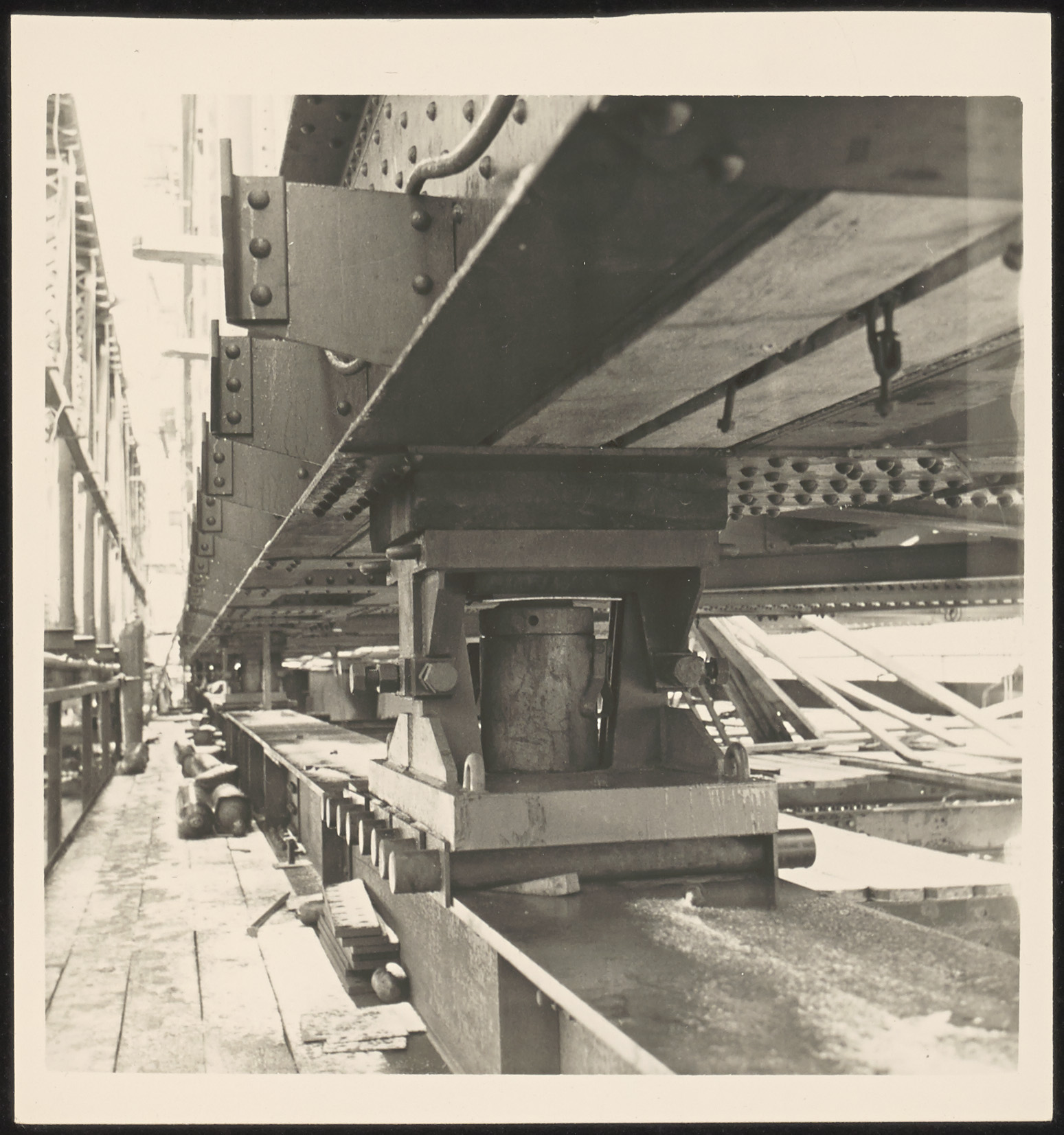 Verrolbare vijzels onder de nieuwe dubbelsporige boogbrug in aanbouw over de Nederrijn bij Oosterbeek. De constructie van de boogbrug is begonnen in maart-april 1950, naast de enkelsporige noodbrug die is geïnstalleerd na WO2, hier links te zien. In het weekeinde van 10-11 mei 1952 zijn de laatste drie overspanningen van de noodbrug verwijderd en is de voltooide boogbrug op zijn definitieve plaats gerold. Op 199_1251 zijn deze vijzels redelijk goed zichtbaar onder de brug in aanbouw. Deze vijzels maken beweging in de lengterichting mogelijk. Onder de ondersteuningsconstructie (waar deze vijzels op staan) staan vijzels dwars op de lengterichting waarmee de brug ingerold kon worden. Ook wel te zien op 199_1251, maar minder opvallend.