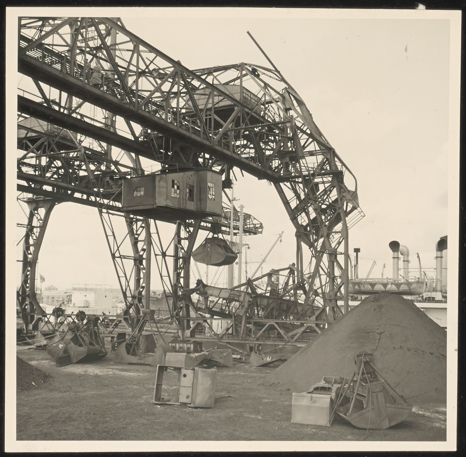 - Een door Penn & Bauduin gebouwde en door een schip beschadigde rijdende ertskraan ofwel grijperloskraan op de loskade van de Vulcaanhaven in Vlaardingen.