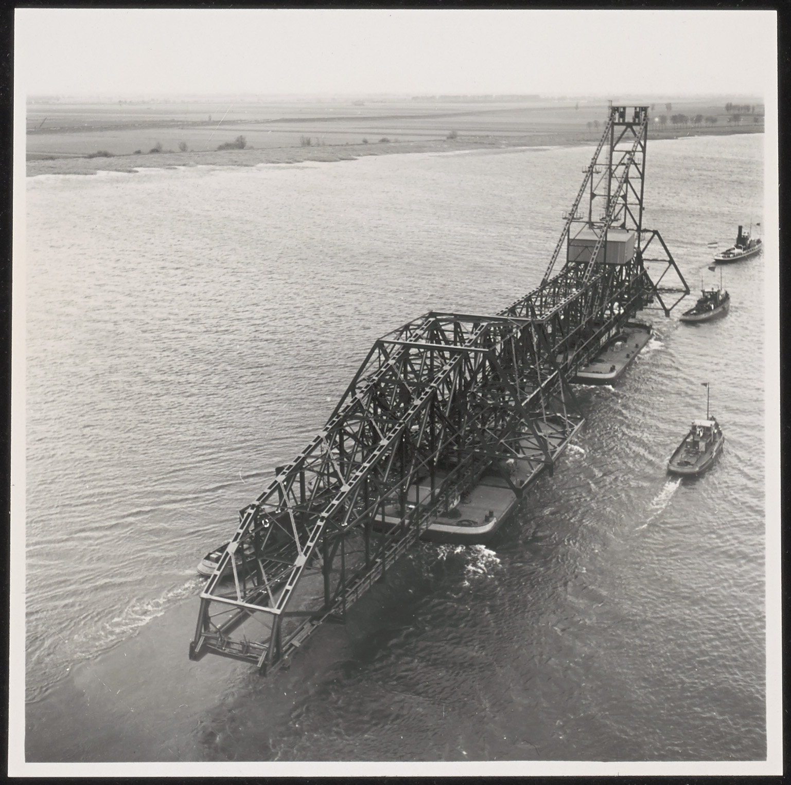 Transport over de Oude Maas van één van de drie brugkranen bestemd voor de Vulcaanhaven …