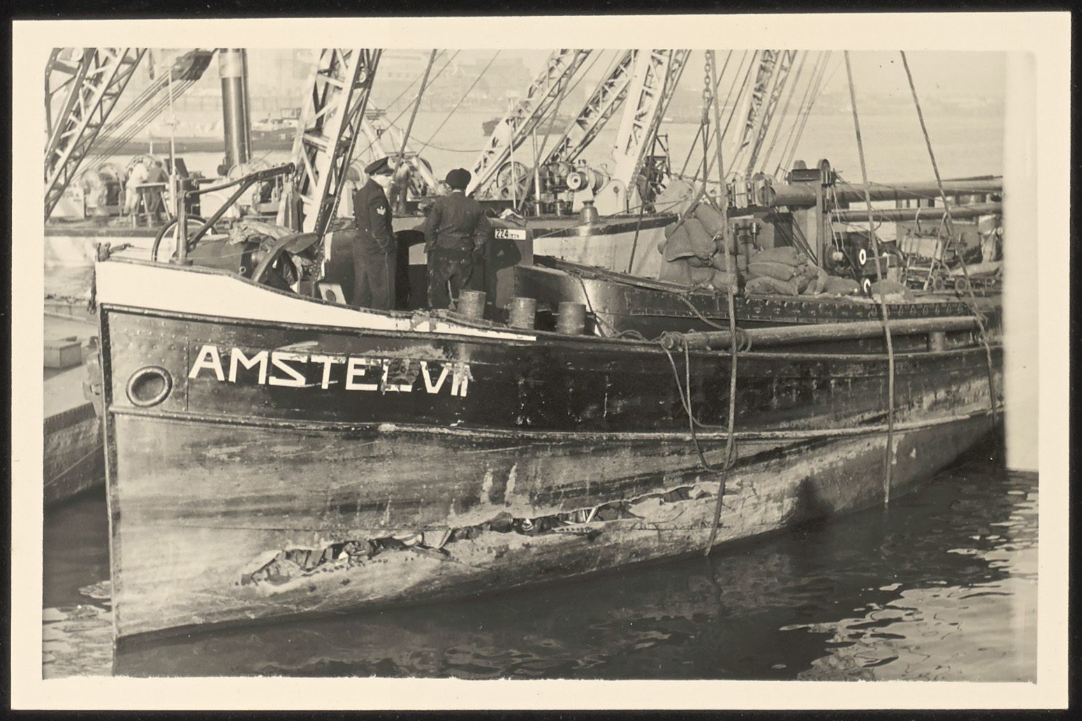 De zwaar gehavende Amstel VII in de takels voor de werf aan de ‘s-Gravendeelsedijk. Algemeen Dagblad, maandag 10 december 1951: “DORDRECHT. — Het 885 ton metende motorschip Hann van de W.T.A.G. Ruhrort dat op weg was naar Antwerpen. is Zondagochtend om kwart over zes enige honderden meters voorbij de brug te Dordrecht in aanvaring gekomen met de Amstel VII van de rederij Van Swieten te Amsterdam. Het laatste schip, dat ongeveer 350 ton meet, werd aan de voorkant aan bakboord geraakt. Men slaagde er in met het schip nog de wal te bereiken, maar daar zonk het binnen een kwartier. De bemanning, evenals vrouw en kinderen van de kapitein kon behouden het schip verlaten. De Hann, die lichte schade had opgelopen, zou vandaag zijn reis naar België vervolgen.” https://resolver.kb.nl/resolve?urn=MMKB19:000335139:mpeg21:p00001