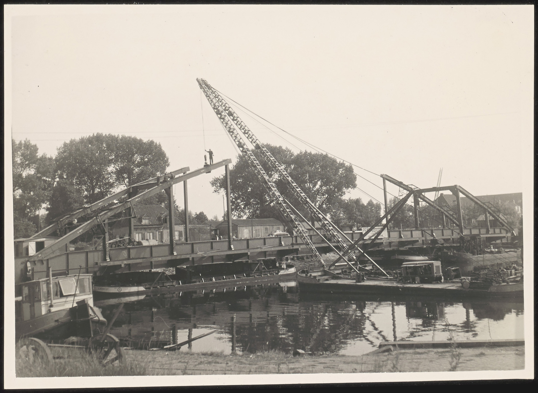 Afmonteren van de bovenbouw van de toekomstige IJsselbrug in de N317 bij Doesburg. Waarschijnlijk in een haven nabij de eindbestemming. De brug is 15 september 1951 ingehesen.