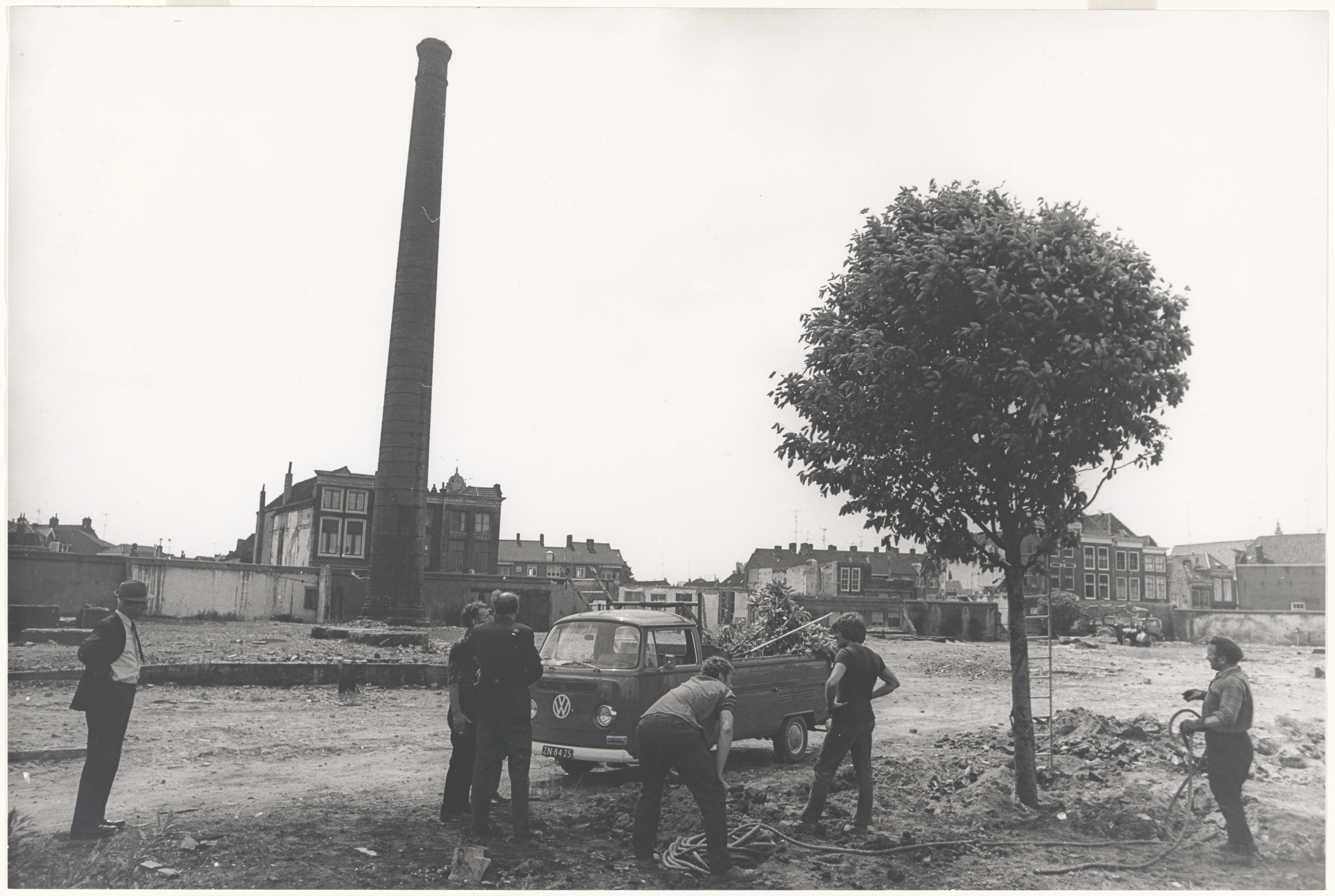 - Verwijderen van een boom op het terrein van de gesloopte gasfabriek, de Riedijk op de achtergrond.
