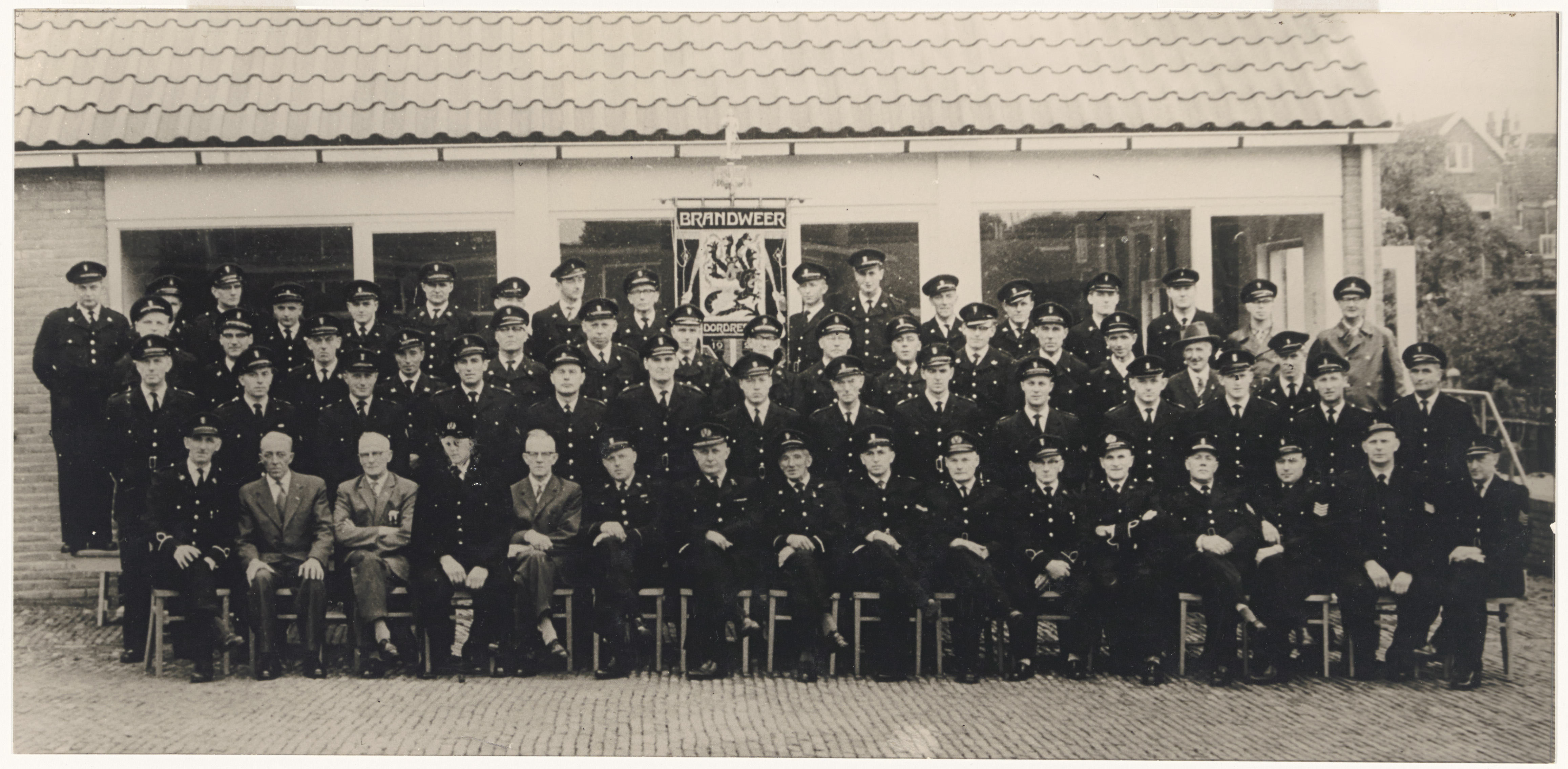 - Het voltallige personeel van de Dordtse beroepsbrandweer en enkele vrijwillige brandweerlieden voor het instructielokaal op de binnenplaats van de brandweerkazerne aan de Vest. In het midden, zittend onder het vaandel, 7e van links commandant H. Muller.