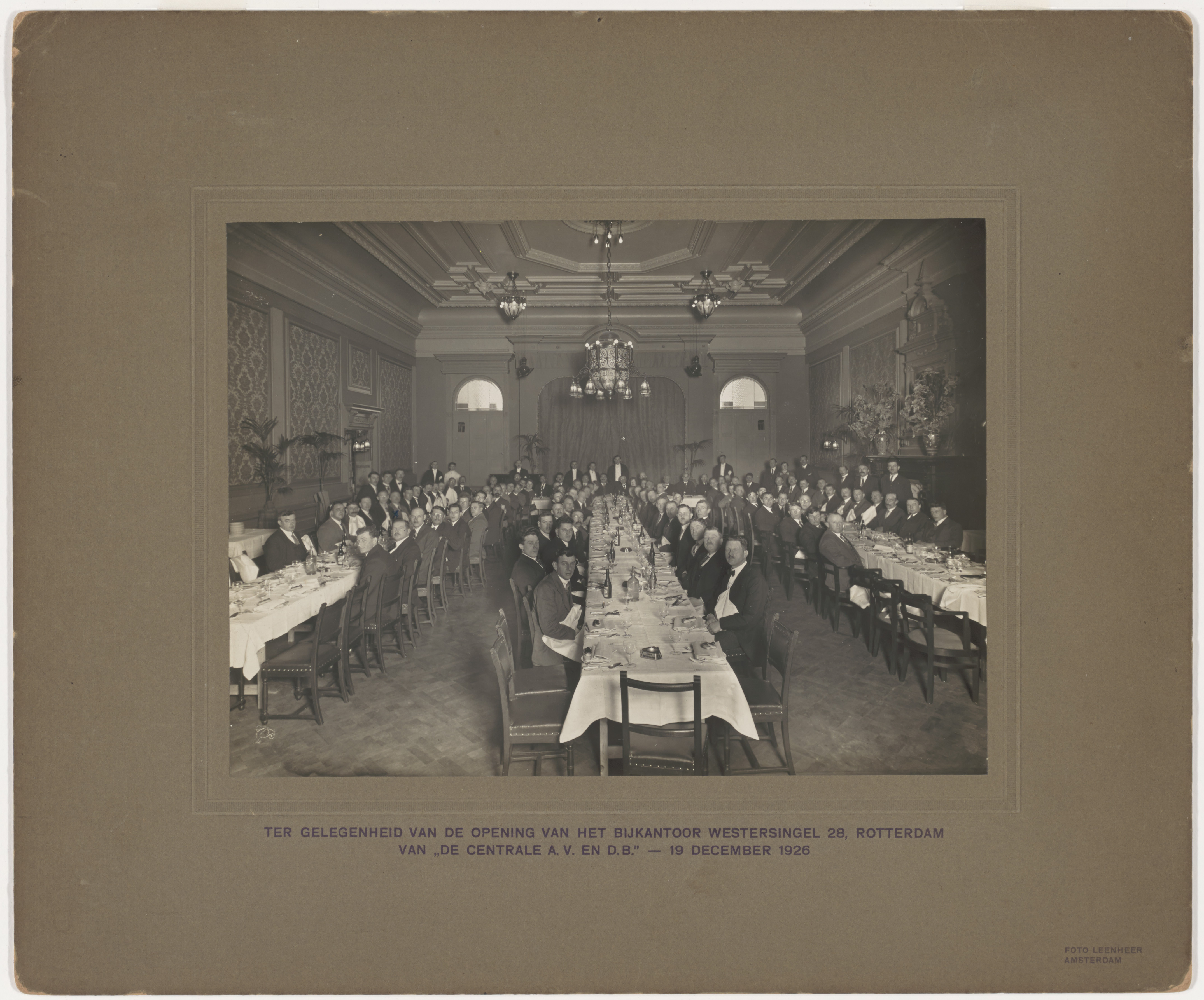 Foto van de genodigden bij de opening van het bijkantoor Rotterdam, Westersingel 28b, op 19 december 1926.