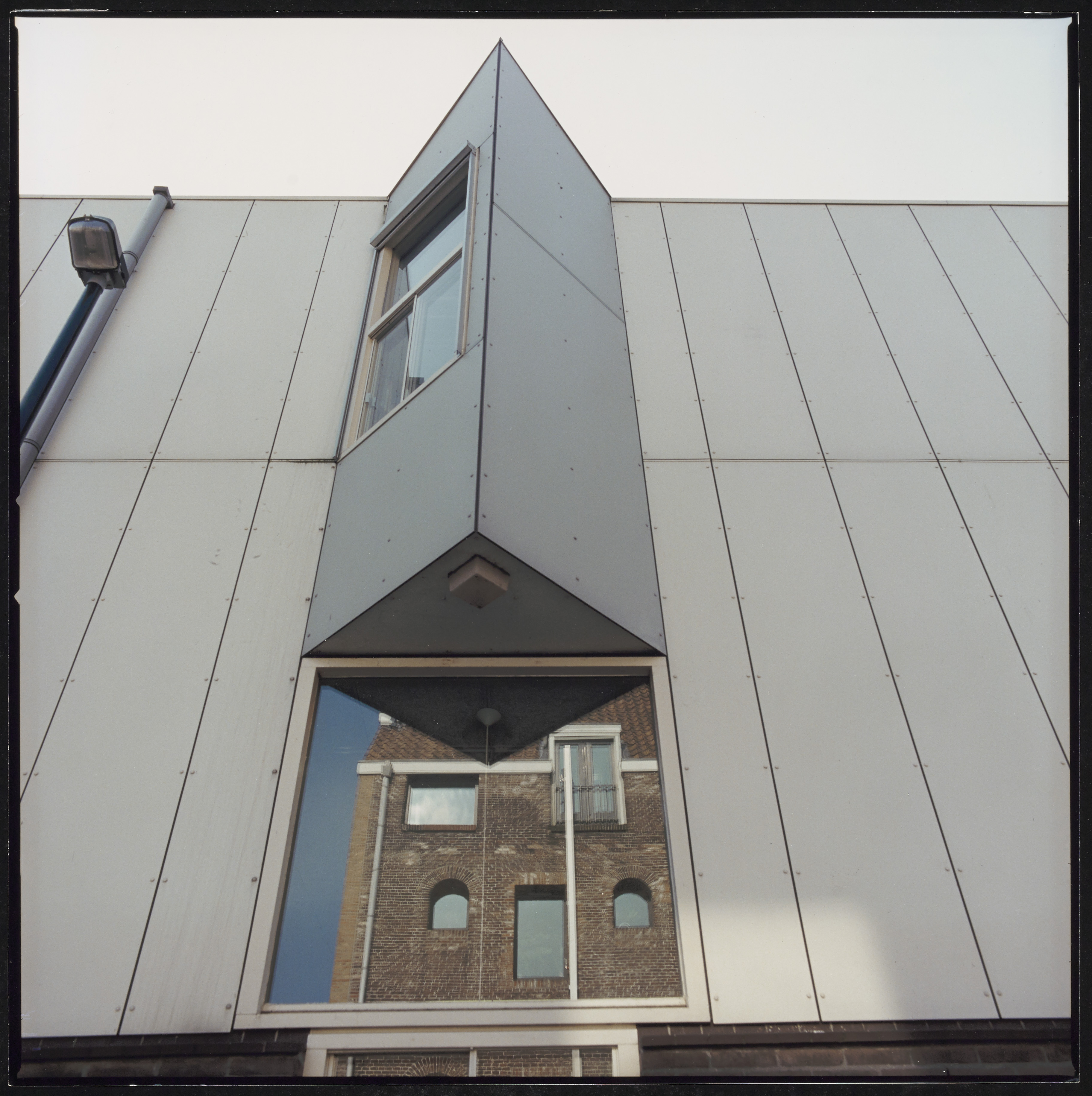 Aanbouw van de bibliotheek in de Vleeshouwerssteeg. In het raam de waarspiegelng van …