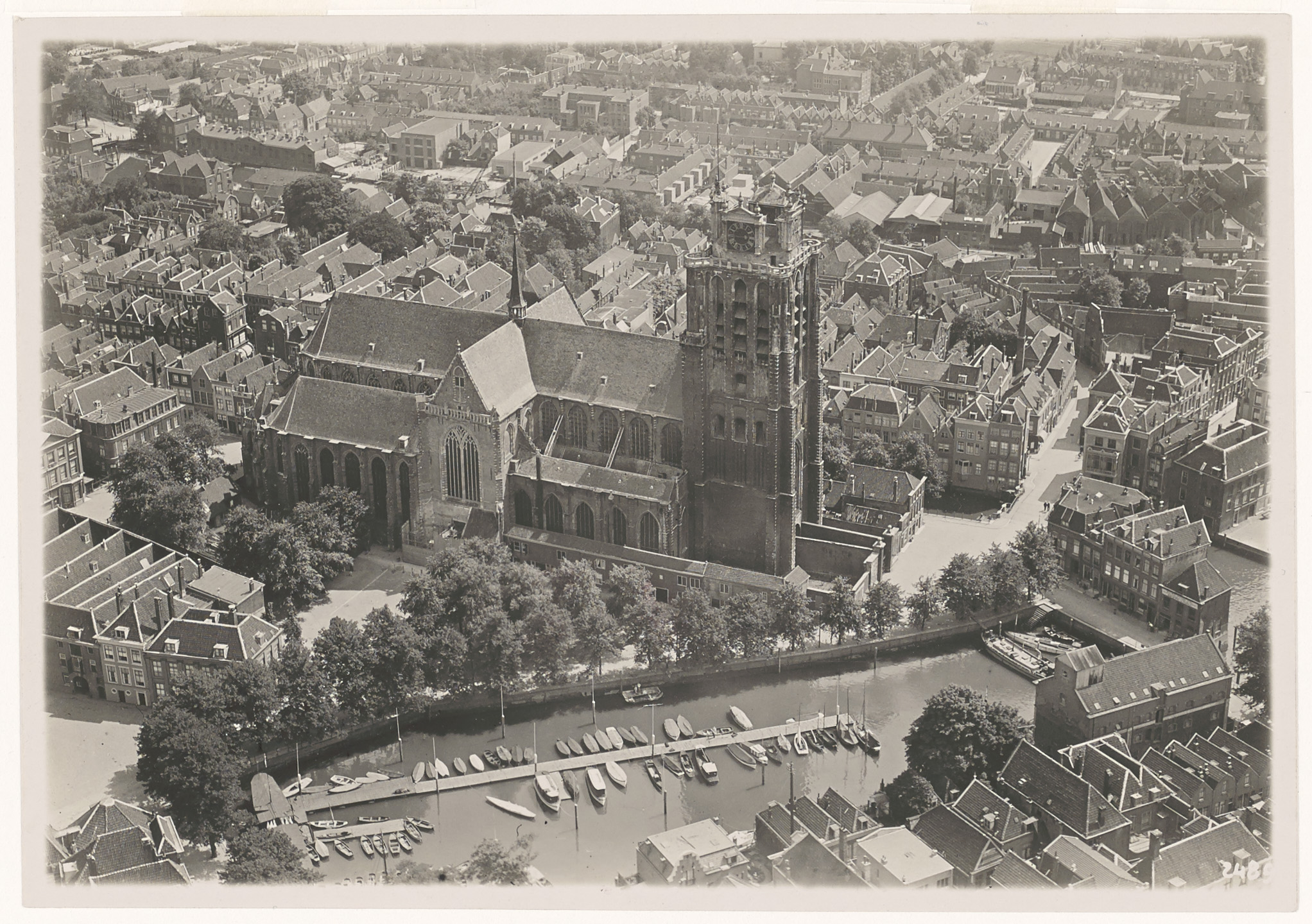 - Luchtfoto van het Maartensgat. en de Grote Kerk, gezien naar het zuidoosten. Rechts de Leuvebrug en de Prinsenstraat.