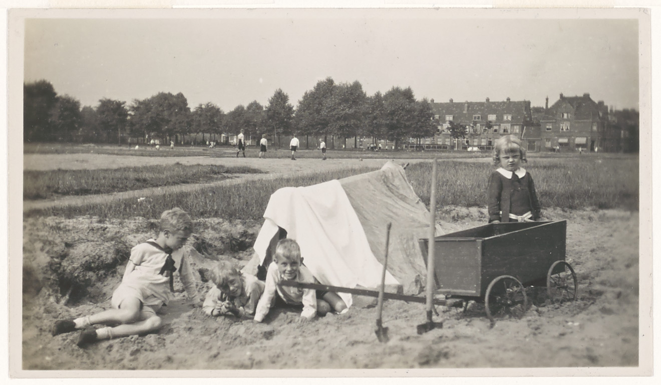- Spelende kinderen op nog onbebouwd terrein op de Staart. Rechts de spekslagerij van A.M. Roodbol op de hoek Johannes Spaanstraat en IJsselstraat.