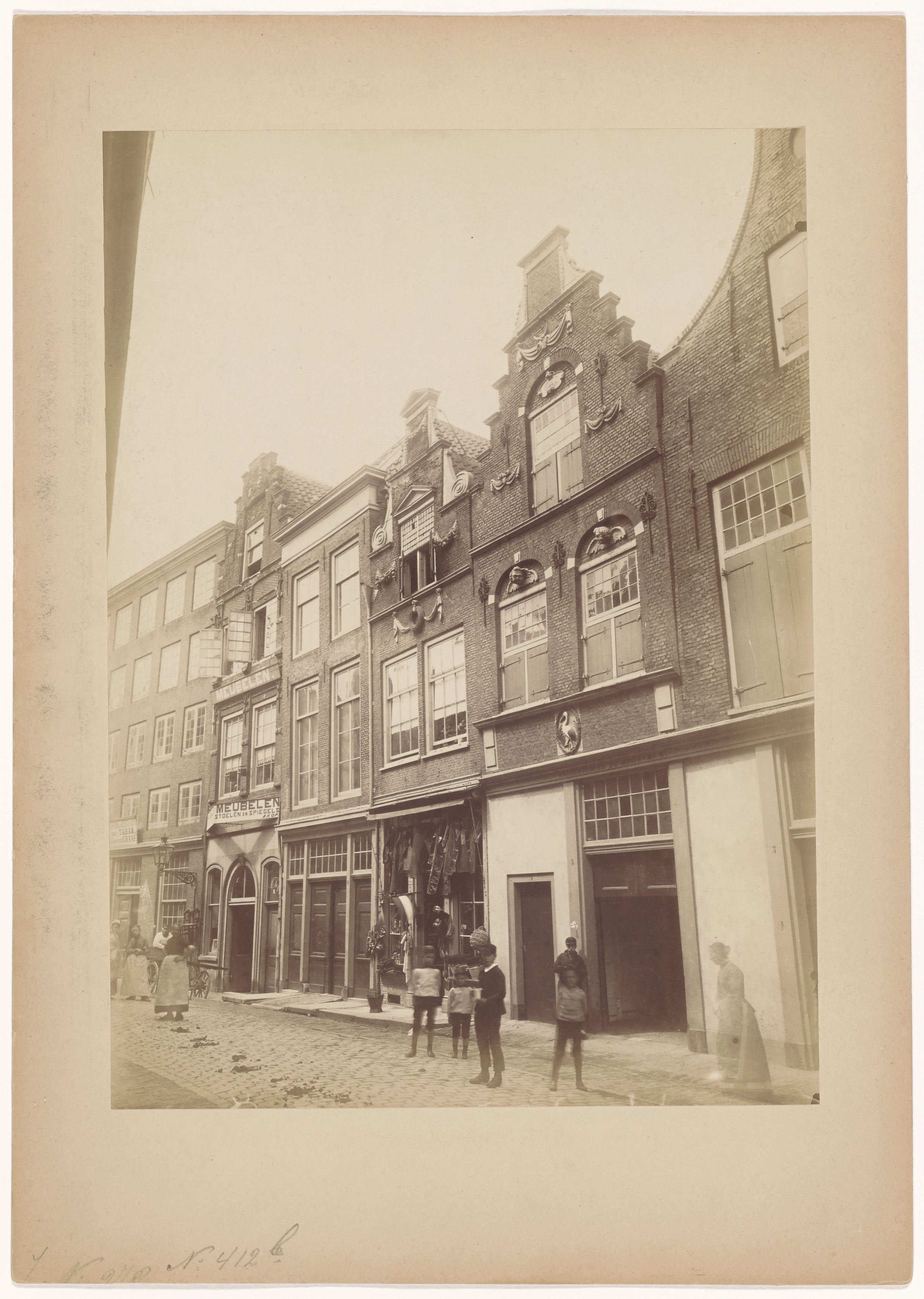 - Bebouwing aan de havenzijde van de Voorstraat tussen het Melkpoortje en de Boomstraat. Rechts distillerderij De Ooievaar met gevelsteen.