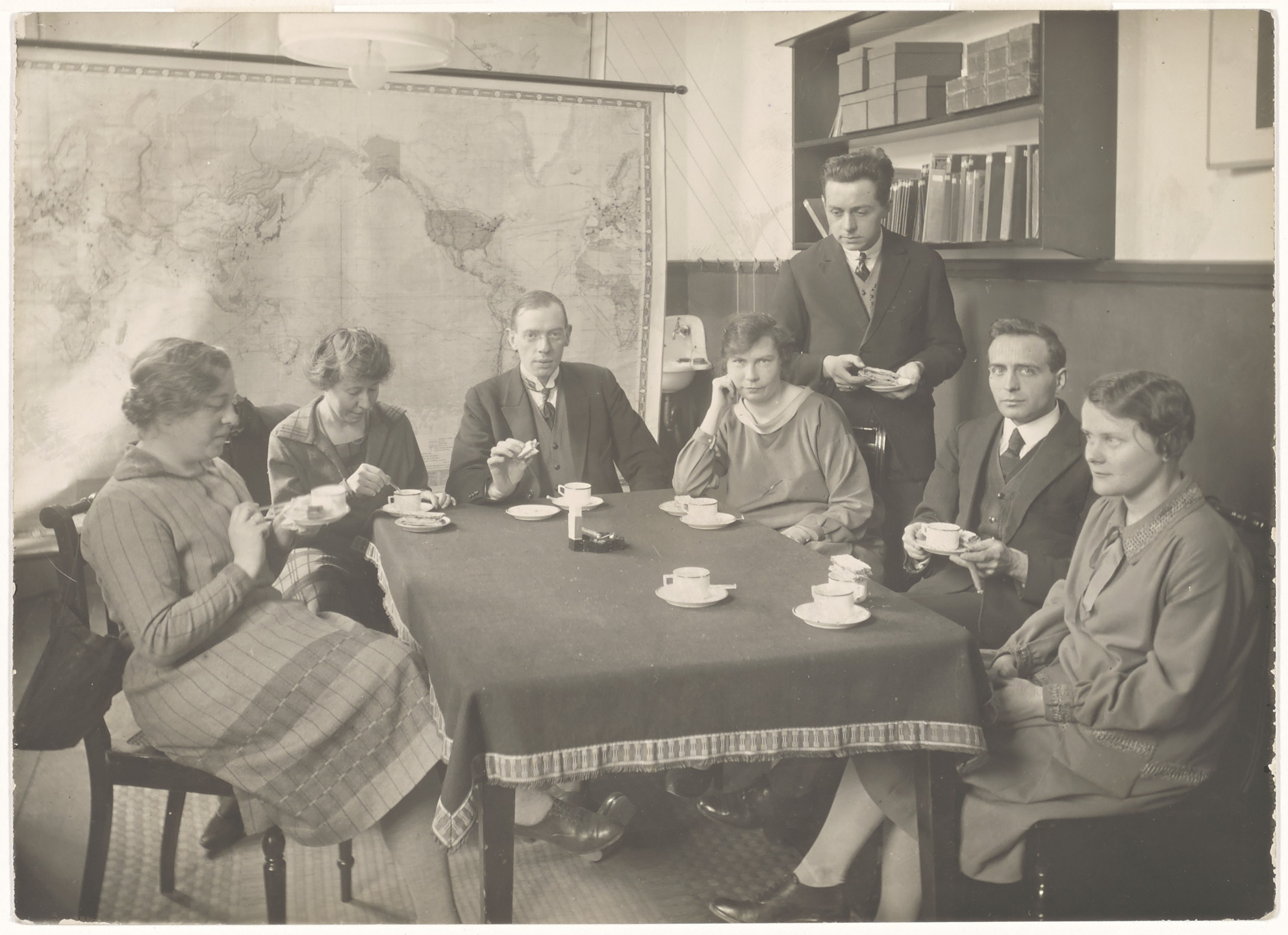 zeven personen aan tafel, koffie met tompouce (wereldkaart) -- (onderwijzers ?)