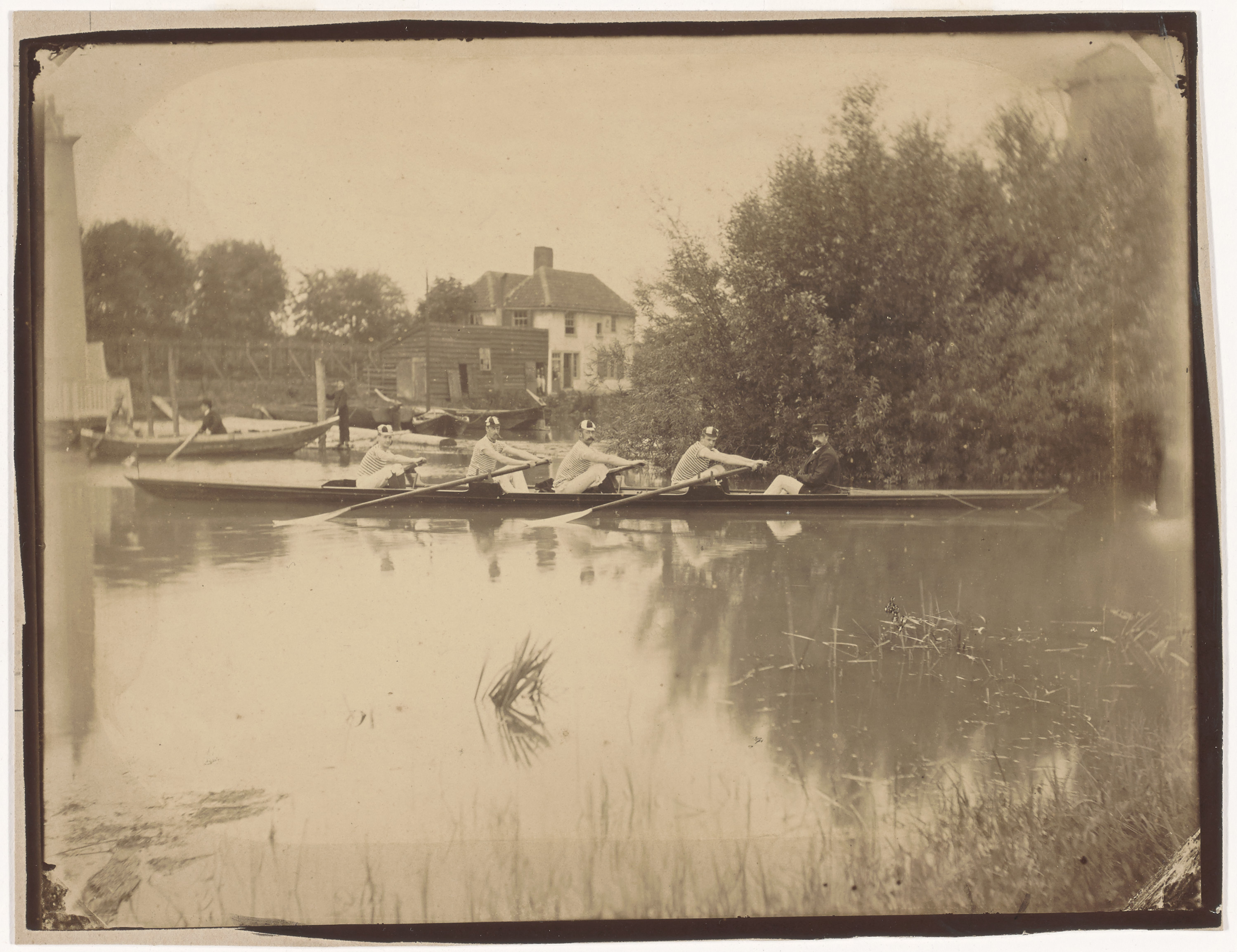 - Leden van de Koninklijke Dordrechtsche Roei- en Zeilvereniging.in een balkengat aan de Noordendijk, V.r.n.l. W. Reus, E. en G.H. Boonen, H.C. Nievervaart en stuurman F. van Brakel; de boot heet Amphitrite.