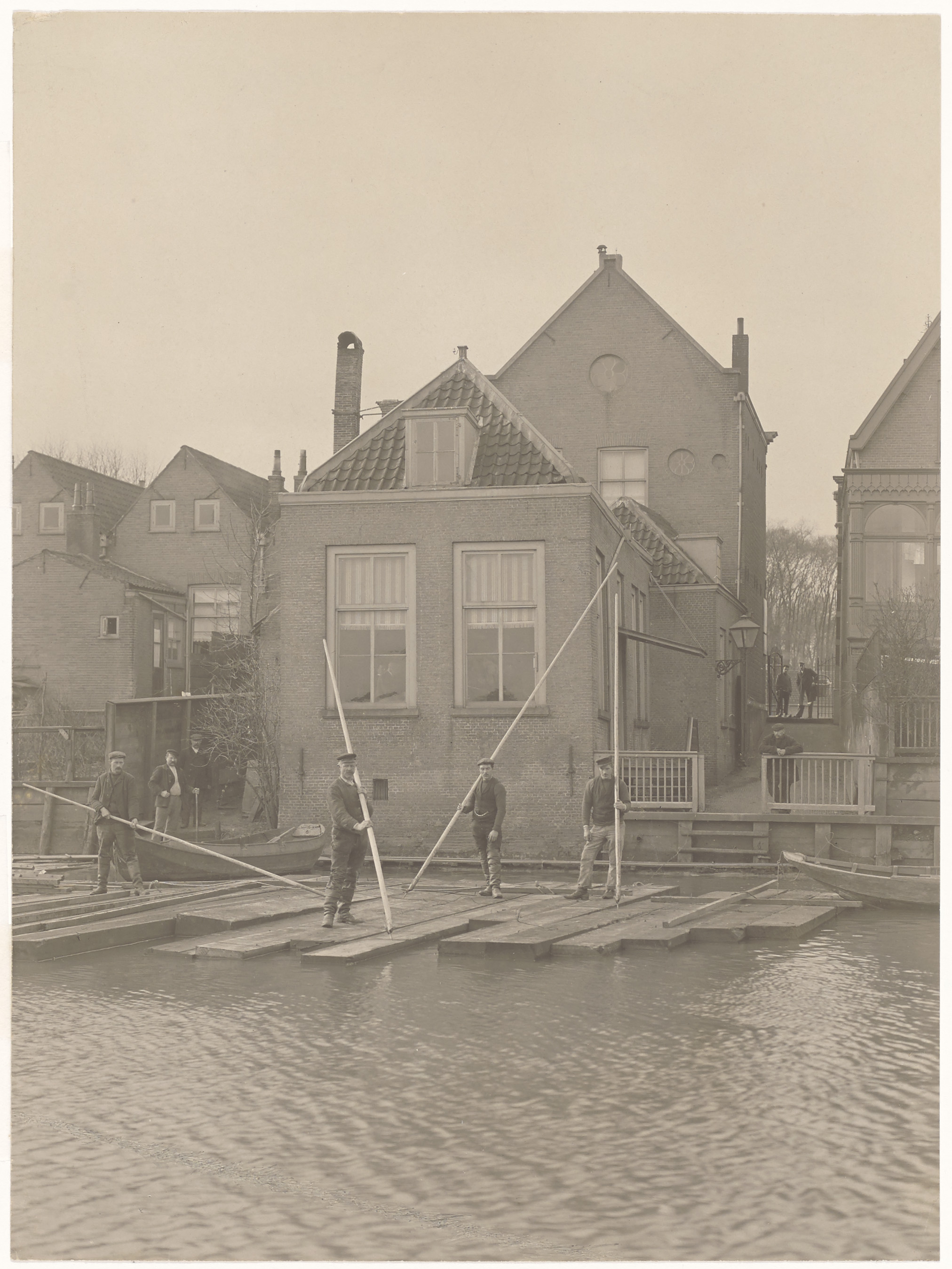 - Houtvlot met werkers in een balkengat achter het huis van houthandelaar Boonen aan de Noordendijk.
