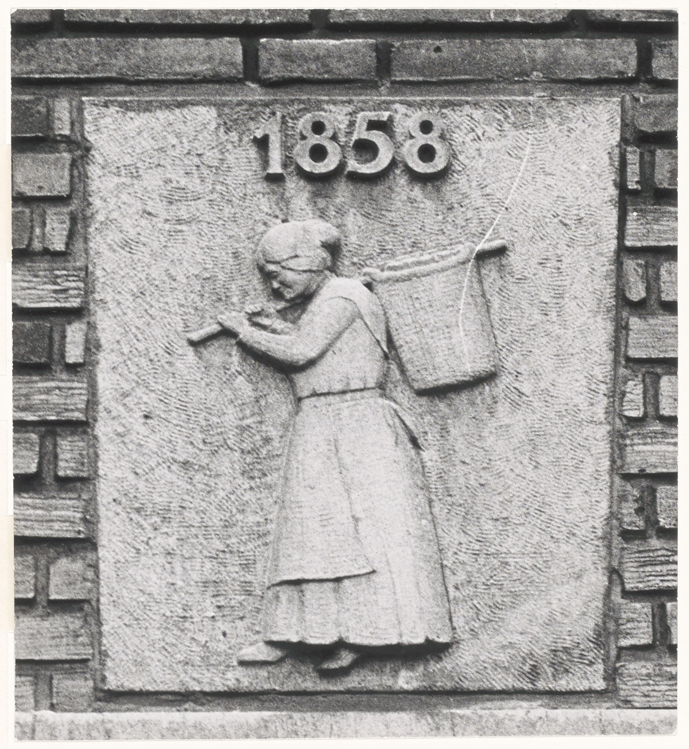 Gevelsteen met jaartal 1858 en turfvrouwtje in de gevel van brandstoffenhandel Van …