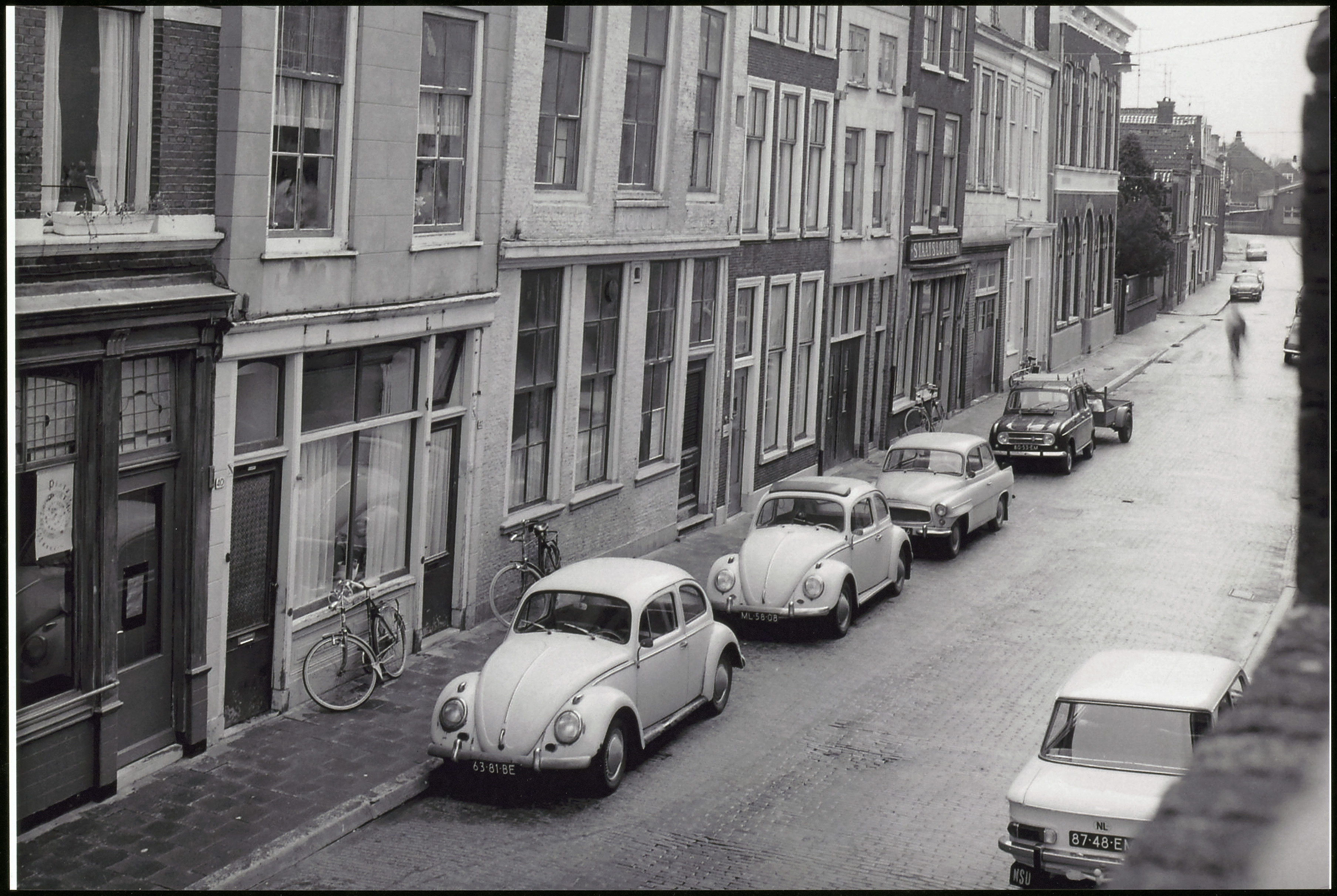 Net voorbij de Renault 4, het huidige Cinema de Movies. Het pand met het gevelbord van de Staatsloterij is Nieuwstraat 52. Links daarvan, nummer 50 geeft toegang middels een poort tot de Kloostertuin. Wanneer je goed kijkt, ontwaar je in het derde pand (44) een gevelsteen met de naam "Pictura" wat er ook nog steeds staat. Alvorens zuster (majoor) De Dreu de voormalige villa van Van Gijn aan de Johan de Wittstraat 10 introk wat door het Leger des Heils van de familie was aangekocht, had ze hier in dit pand, genaamd "Pictura" de zorg over 18 bejaarden. In 1909 begon ze met die mooie werk op een bovenwoning elders in de Nieuwstraat. In 1924 kreeg ze de beschikking over het "Pictura" pand en in 1935 over het veel riantere "Avondzon" aan de Johan de Wittstraat 10. Het pand "Pictura" in de Nieuwstraat werd door enige leden van het tekengenootschap in 1796 voor eigen rekening aangekocht en verbleef daar tot 1829. Daarna vertrok naar de benedenlokalen van de Heelhaaksdoel. Het Tekengenootschap "Pictura" begon op 1 oktober 1774 in de Blauwpoort en heeft sindsdien vele malen moeten verkassen. =================================================================== De panden (puien) links daarvan zijn ingewisseld voor die van de overkant.
