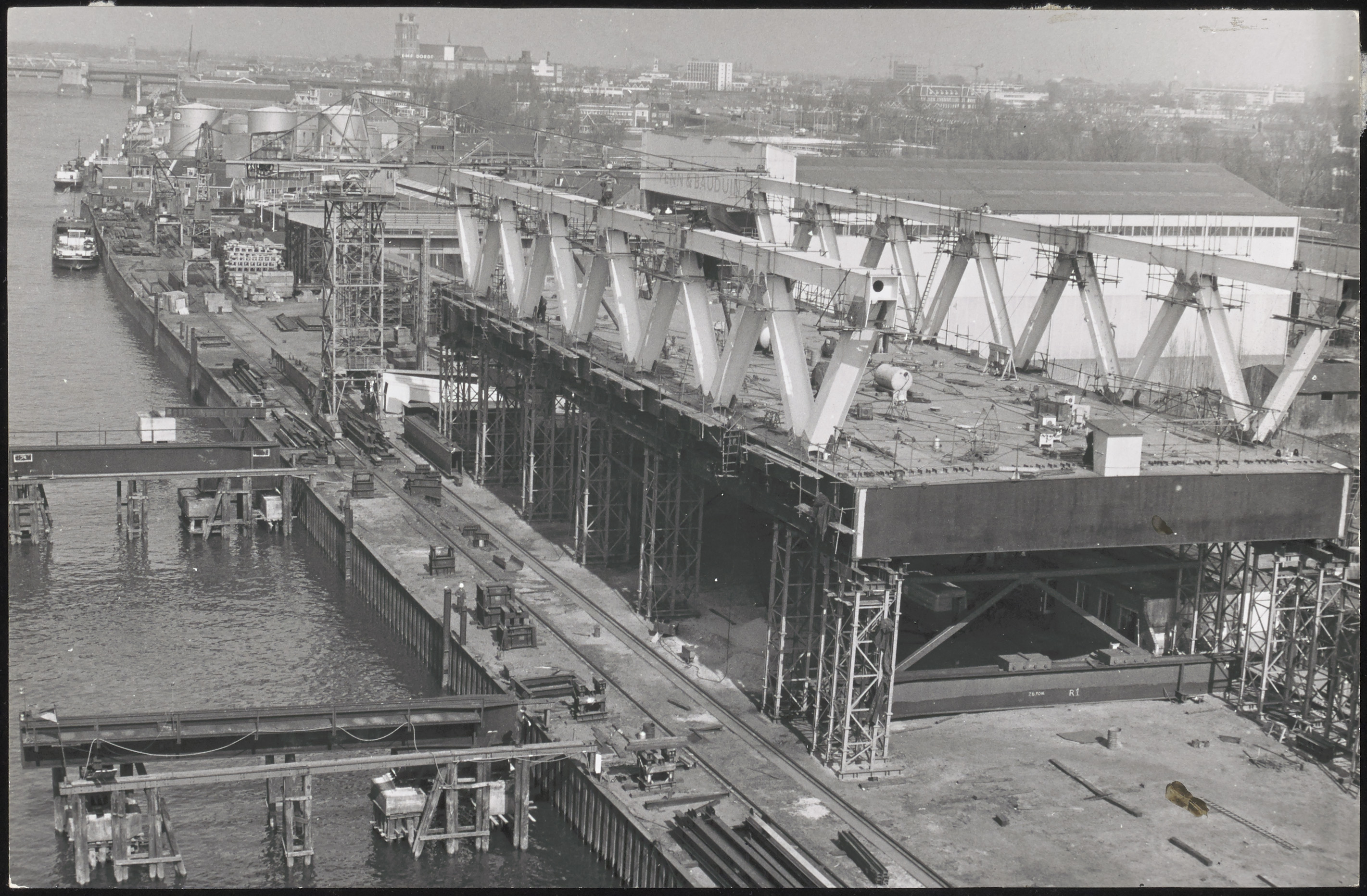 Bouw van een brugdeel van de Calandbrug bij Penn & Bauduin aan de 's Gravendeelsedijk.