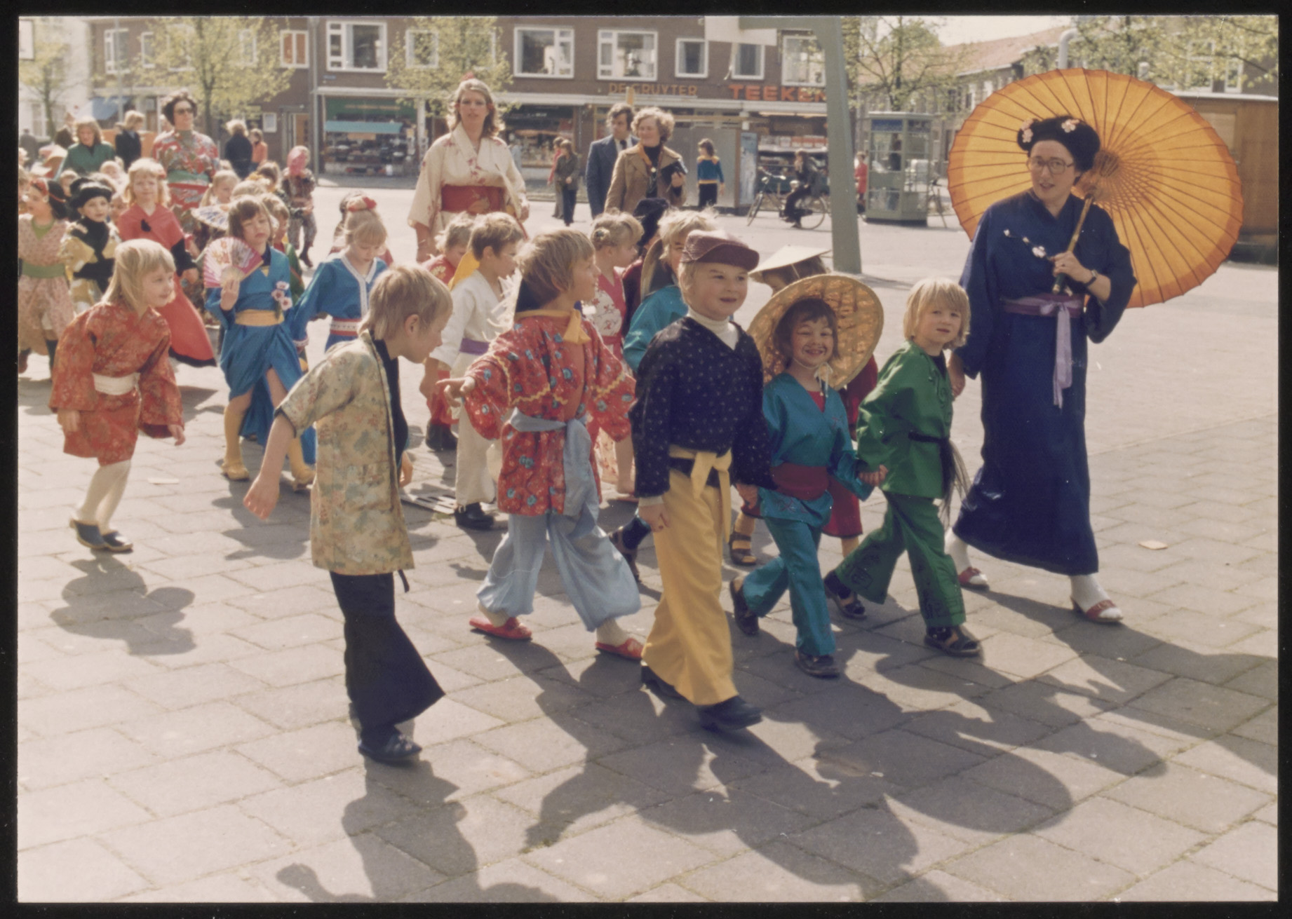 - Schoolkinderen in Chinese kledij op het Vogelplein.