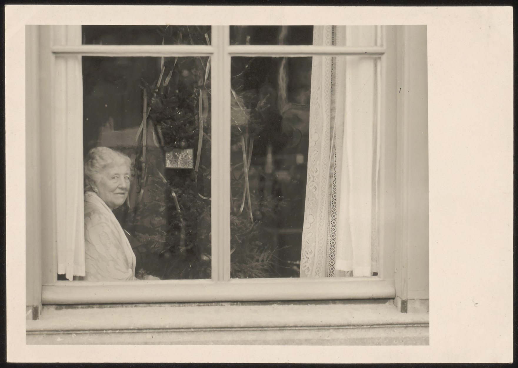 (Sinds 12-3-1885 weduwe van Adolph Blussé van Oud-Alblas). Kijkend uit het raam van haar woning, Steegoversloot 33. *27-4-1854 -/- †8-12-1937.