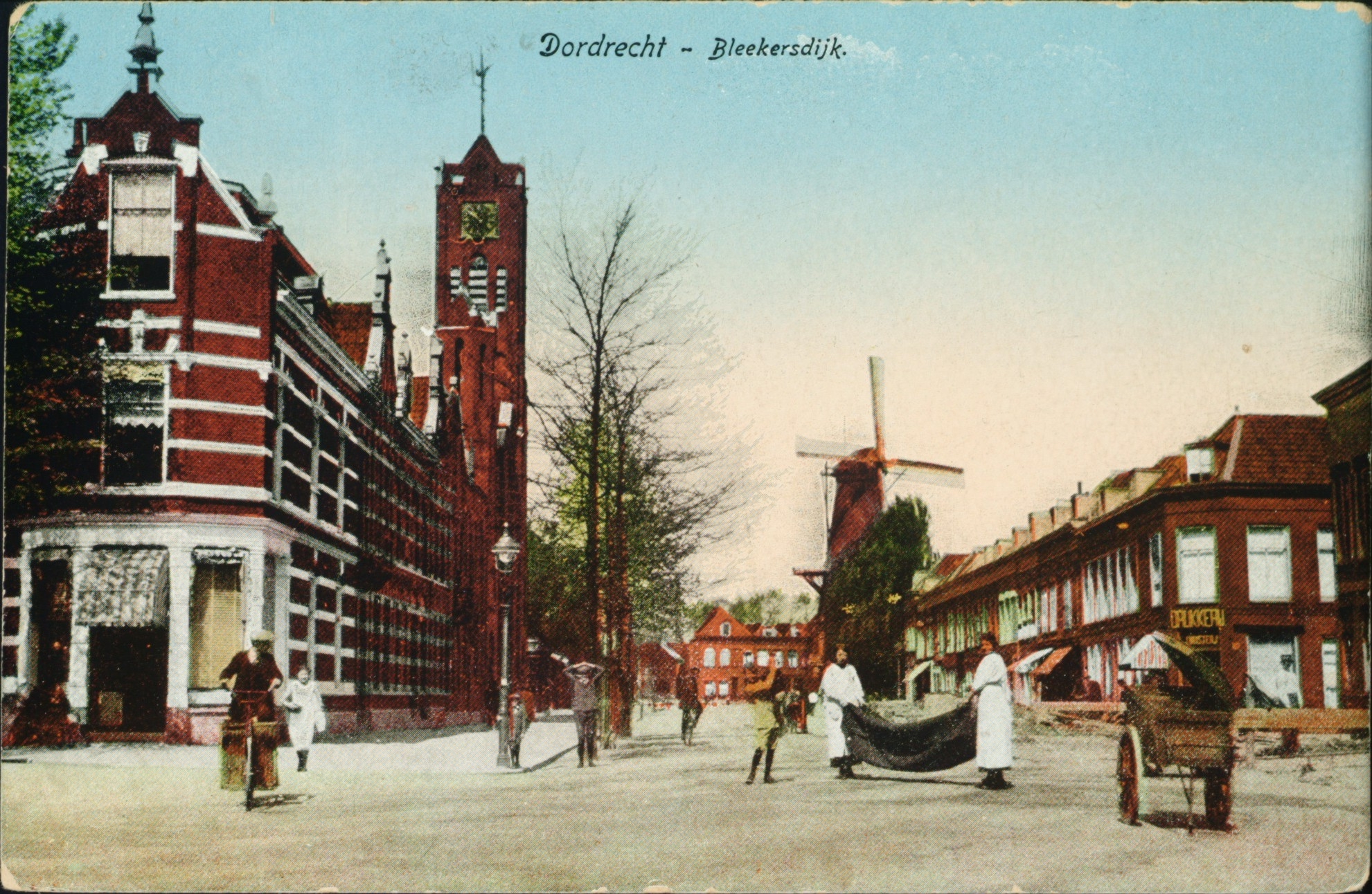 - De Blekersdijk vanaf de Adriaan van Bleijenburgstraat (links) richting de Wilhelminakerk en molen De Maagd aan de Cornelis de Wittstraat. Rechts vooraan de Waterbeekstraat.