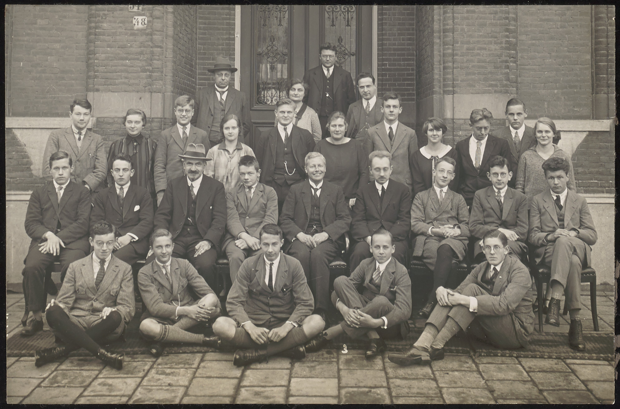- Klassenfoto voor de ingang van het Gymnasium aan de Cornelis de Wittstraat.