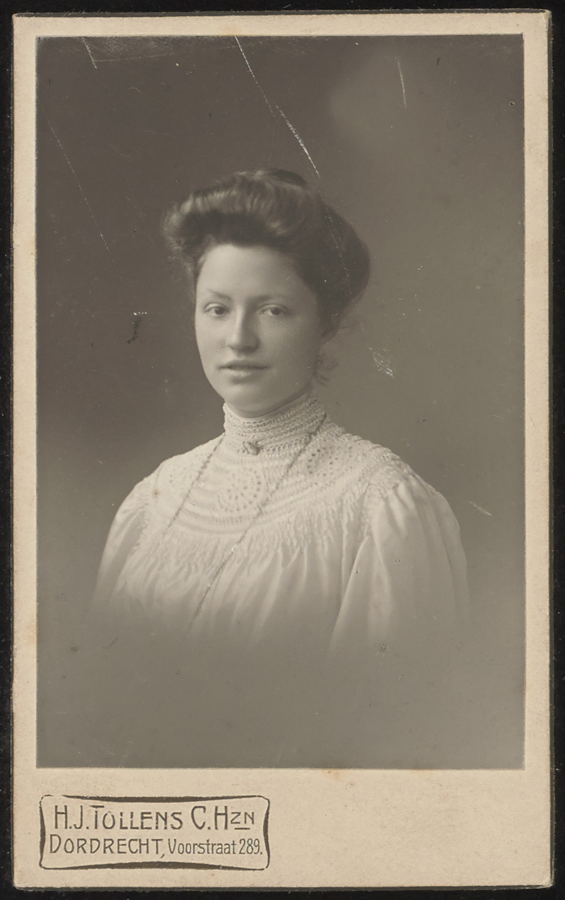 portret van een vrouw (fotograaf H.J. Tollens C.Hzn, Voorstraat 289, Dordrecht)
