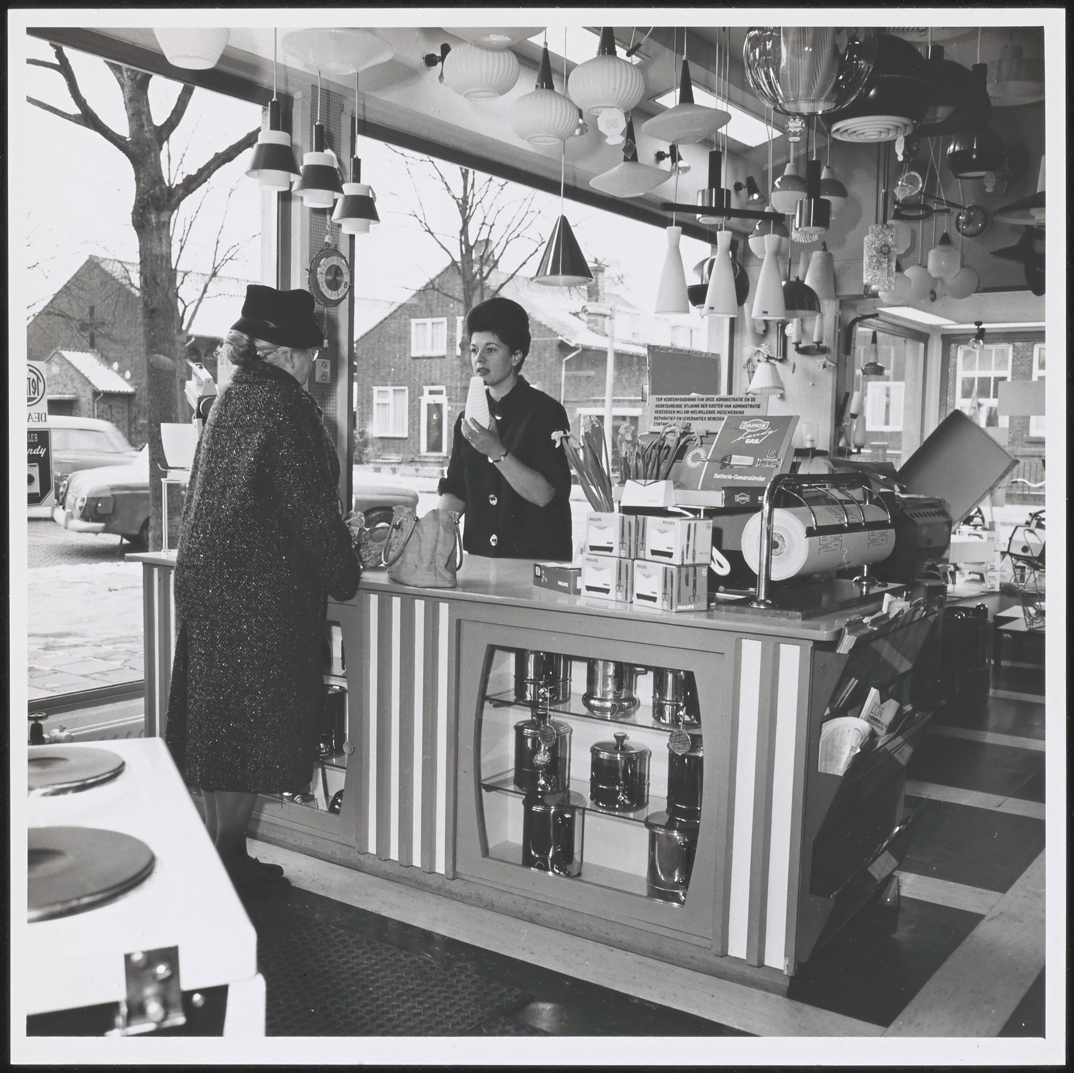 - Winkelinterieur van firma Verkerk elektrotechniek op de hoek van de Burgemeester de Bruïnelaan en het Raadhuisplein in Zwijndrecht.