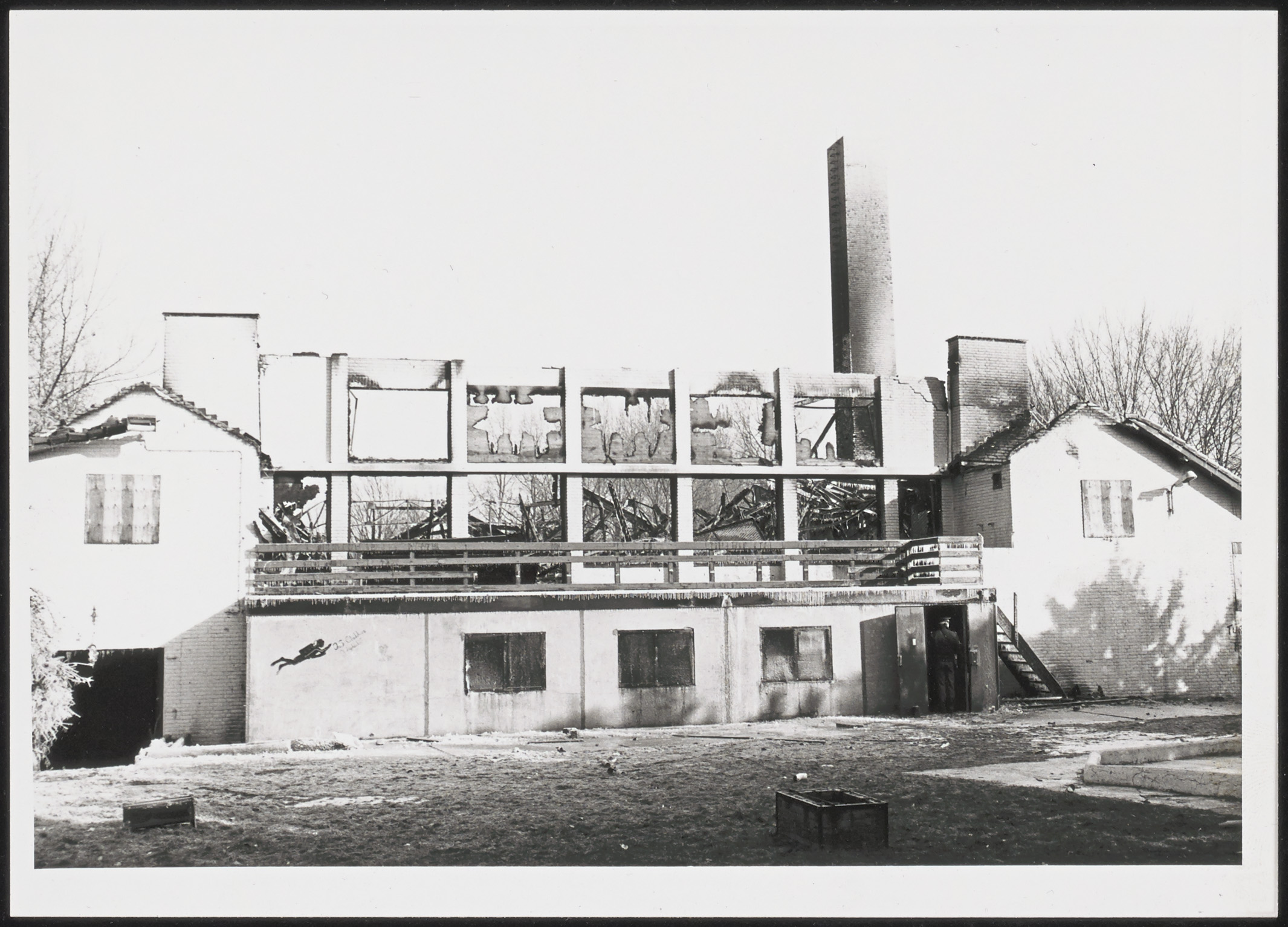 - Het door brand verwoeste Sportfondsenbad aan de Brandts Buysstraat.