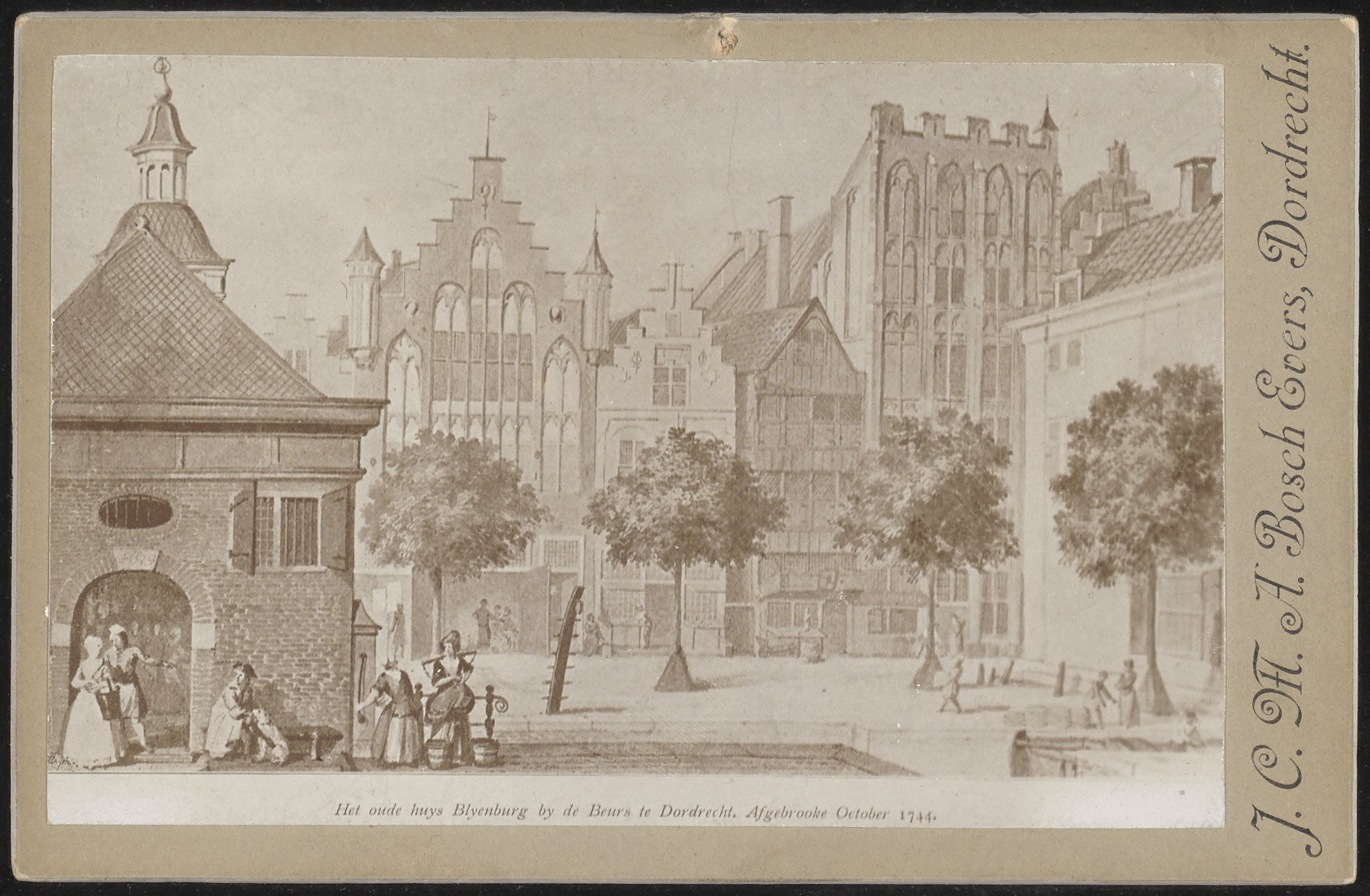 - Tekening (in kleur) door A. Schouman van de Beurs (Scheffersplein). V.l.n.r. de Vleeshal (gebouwd over de Voorstraatshaven, met gevelsteen 1679), de huizen Scharlaken (de Waag), Leeuwensteyn, Den Asijnhoff en Blijenburg.