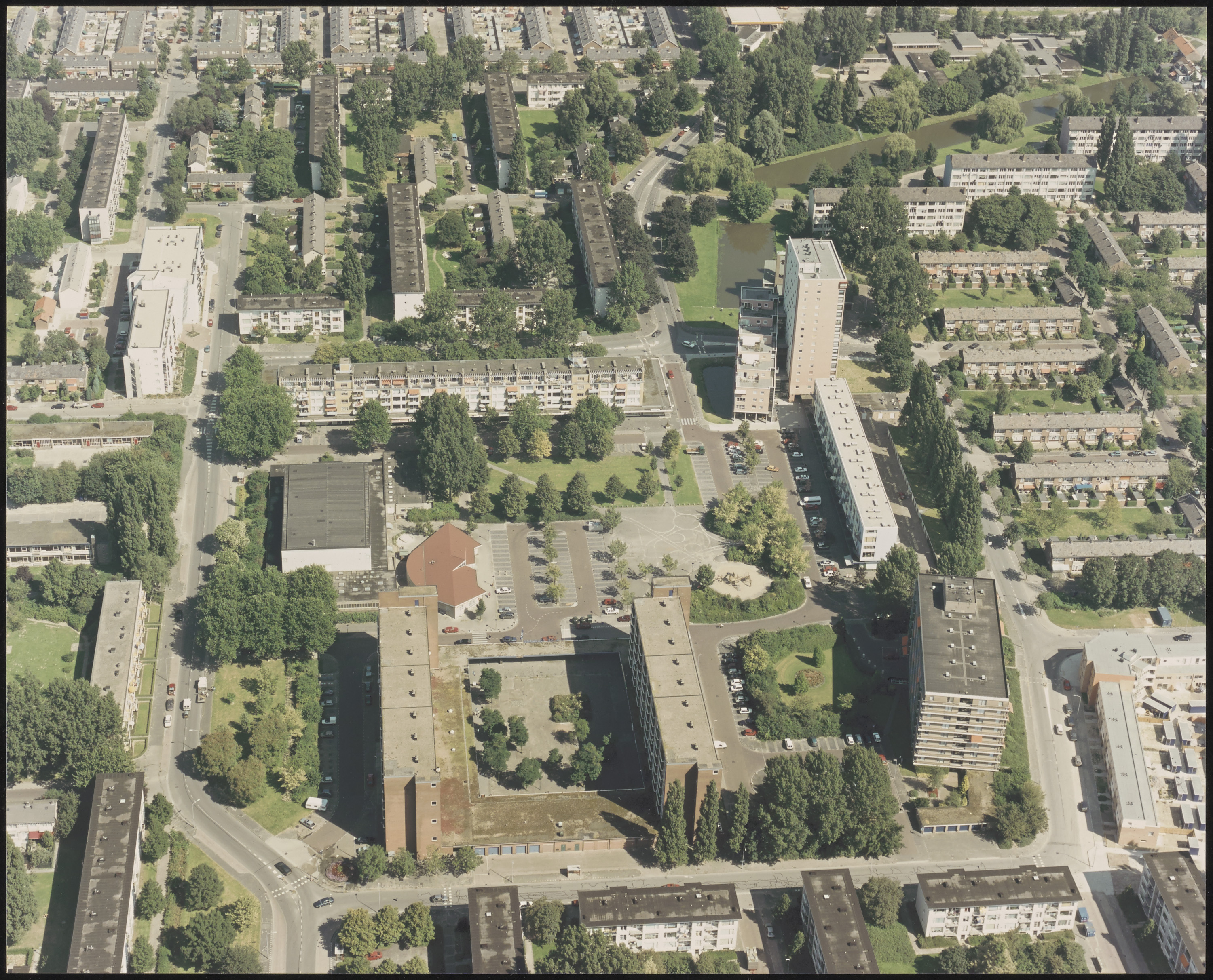 Luchtfoto van Wielwijk met centraal het winkelcentrum en de sporthal aan het …