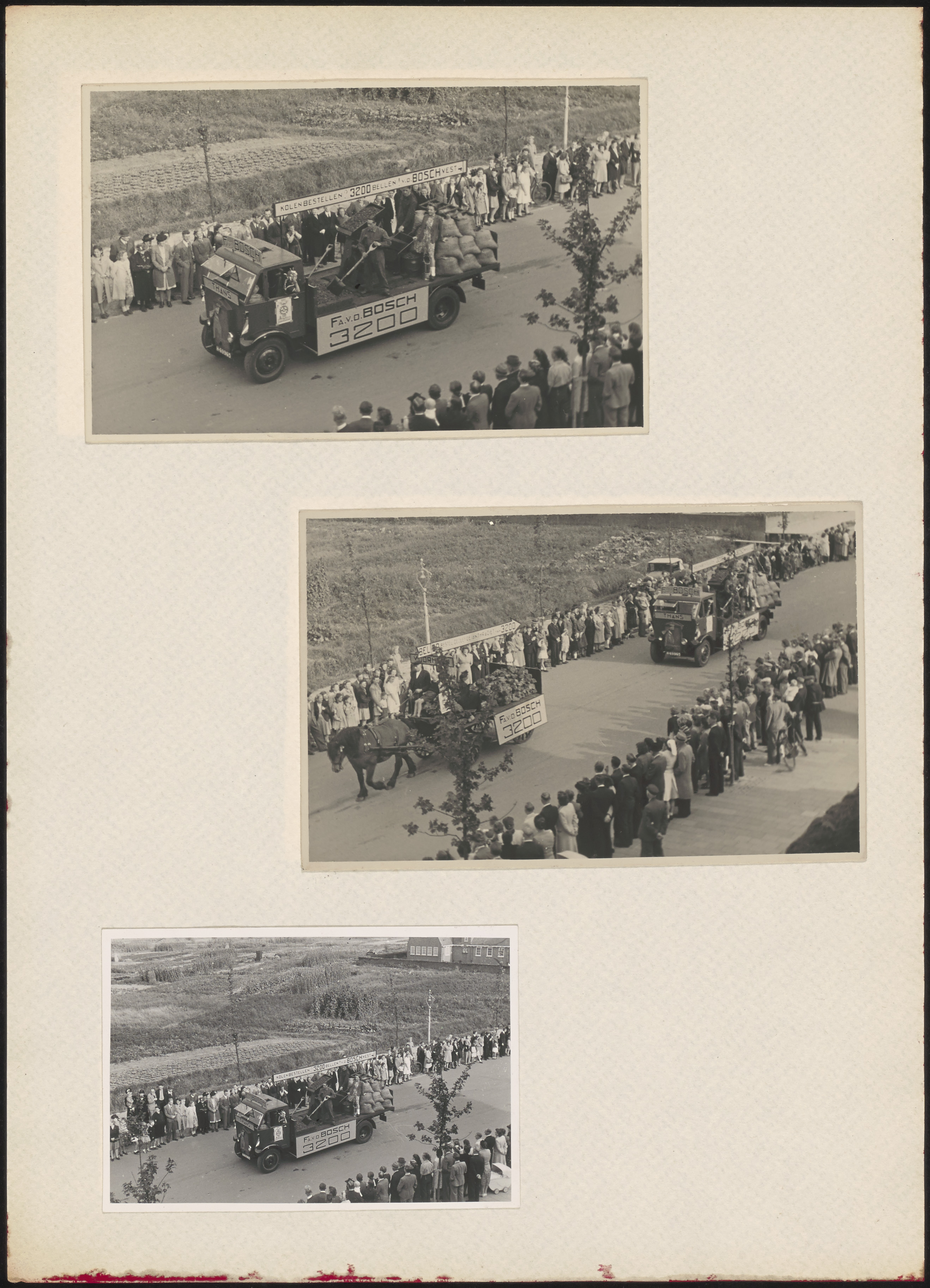 - Optocht met versierde vrachtwagens en paard en wagen op de Krispijnseweg.