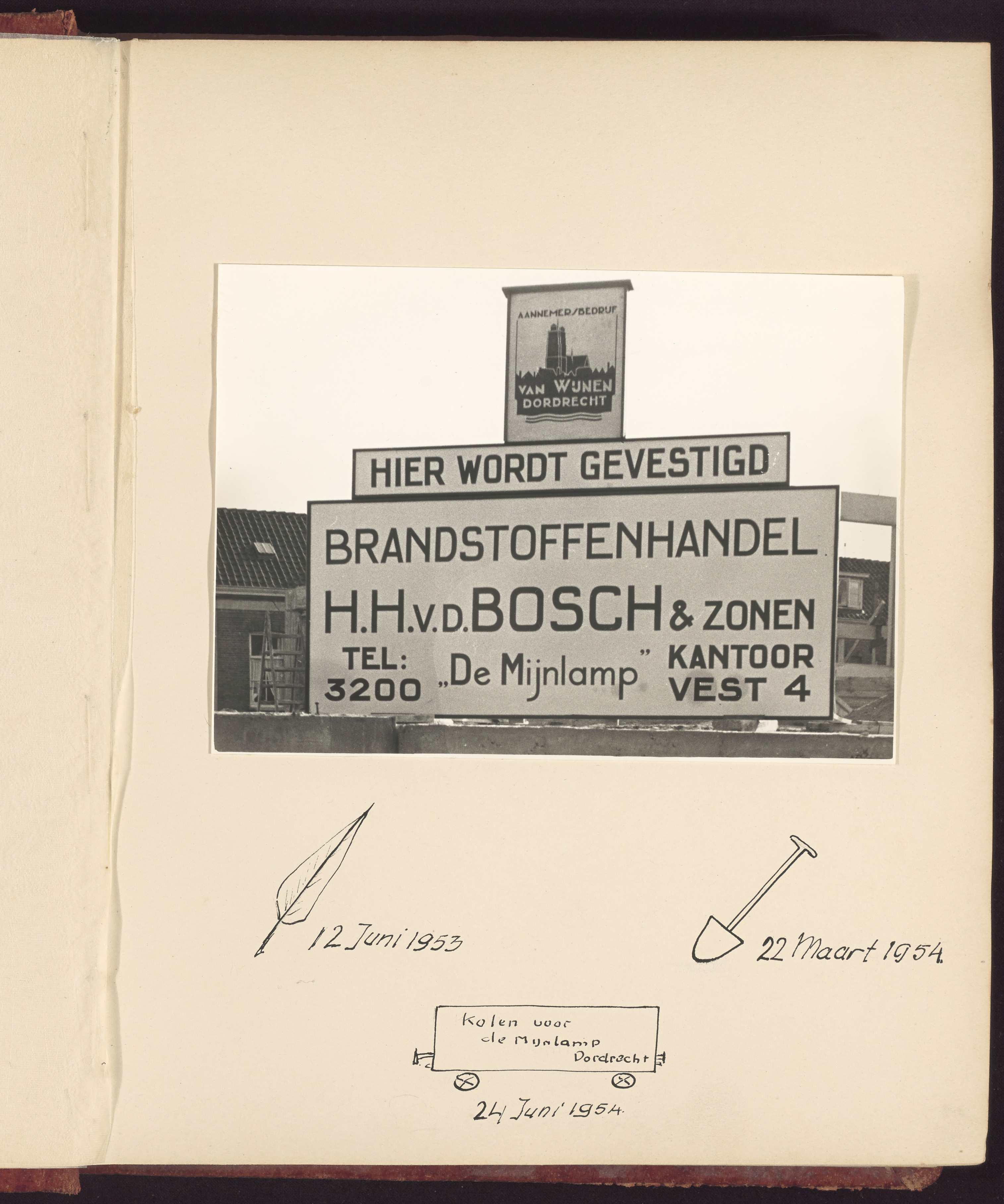 - Reclamebord van aannemer Van Wijnen bij de bouw van de opslagplaats van kolenhandel Van den Bosch aan de Noordendijk tussen Groenendijk en Oranjelaan.