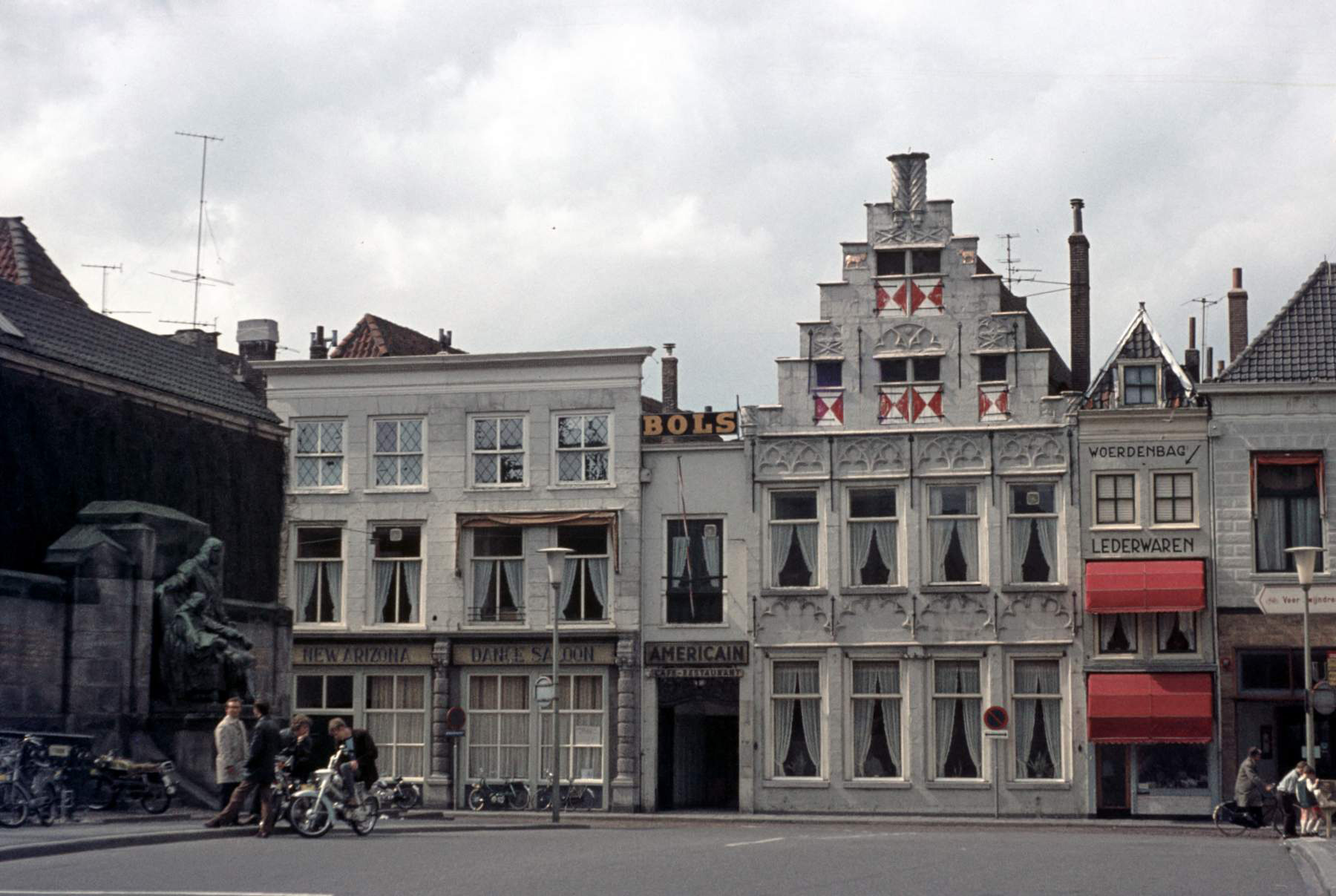 - De Visbrug richting gebouw Americain op de Groenmarkt. Links het standbeeld van de gebroeders De Witt.