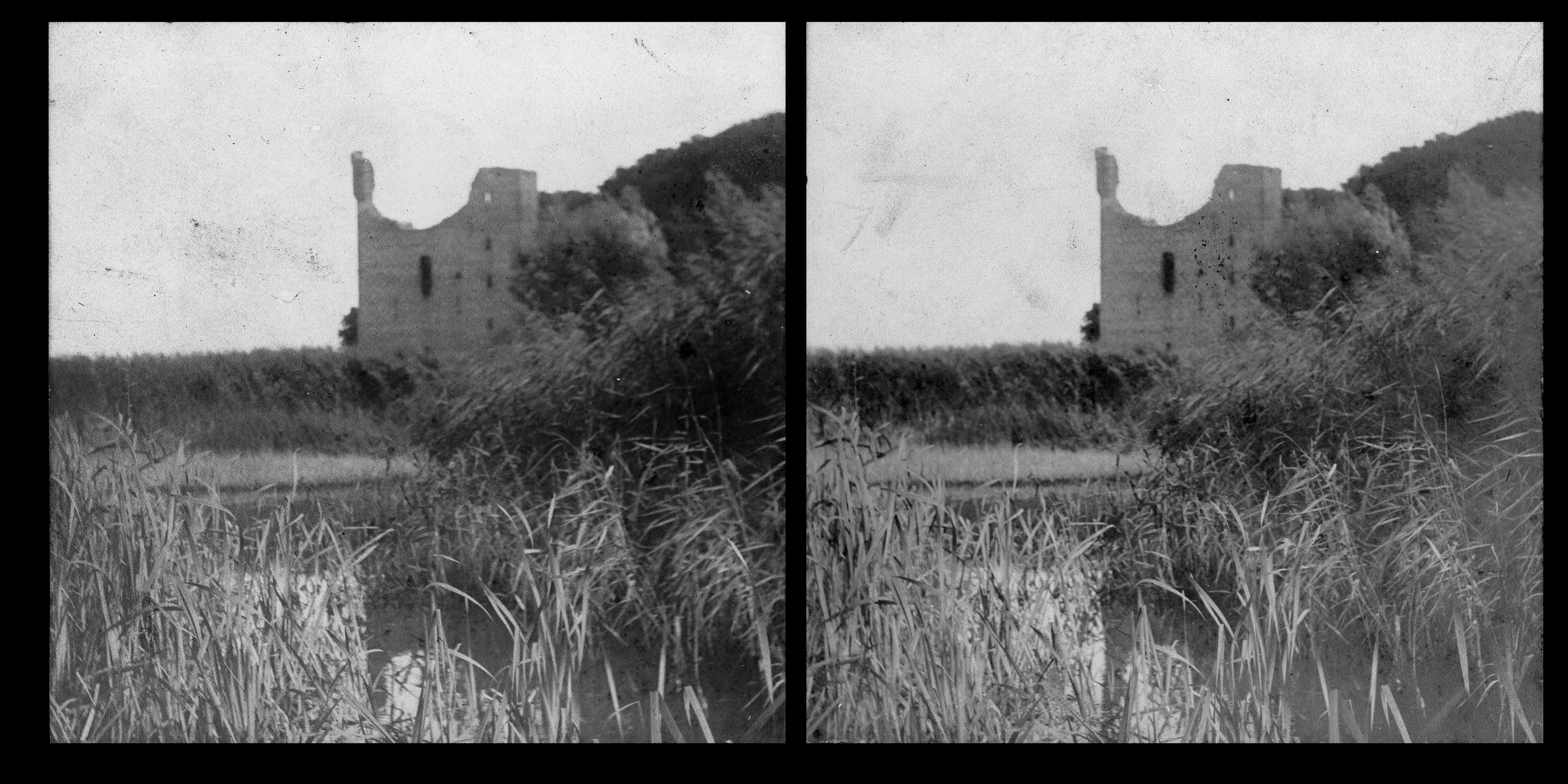 Stereofoto van de ruïne Huis te Merwede op de Kerkeplaat.