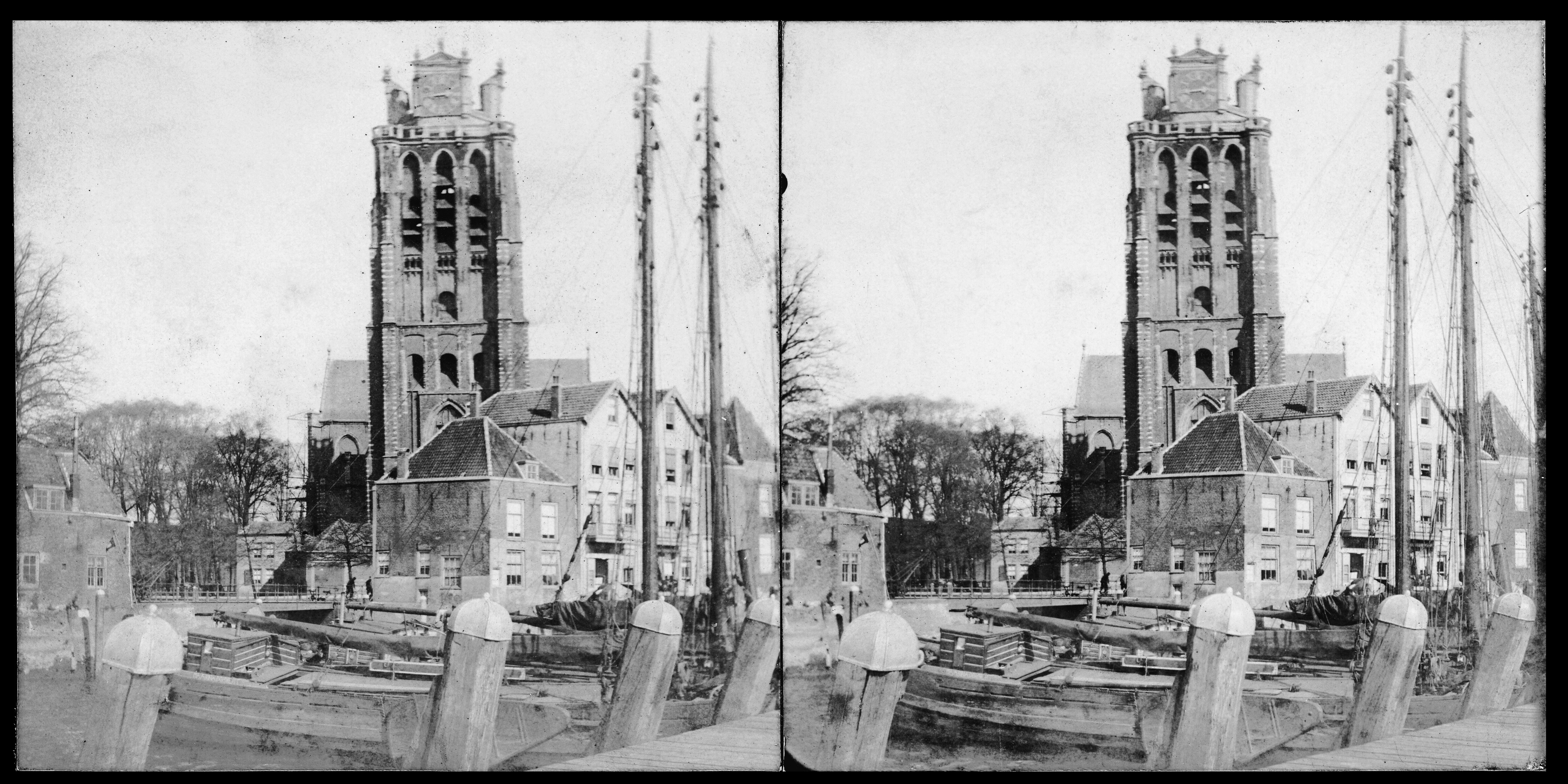 - Stereofoto over de Bomhaven richting Korte Geldersekade en Grote Kerk.