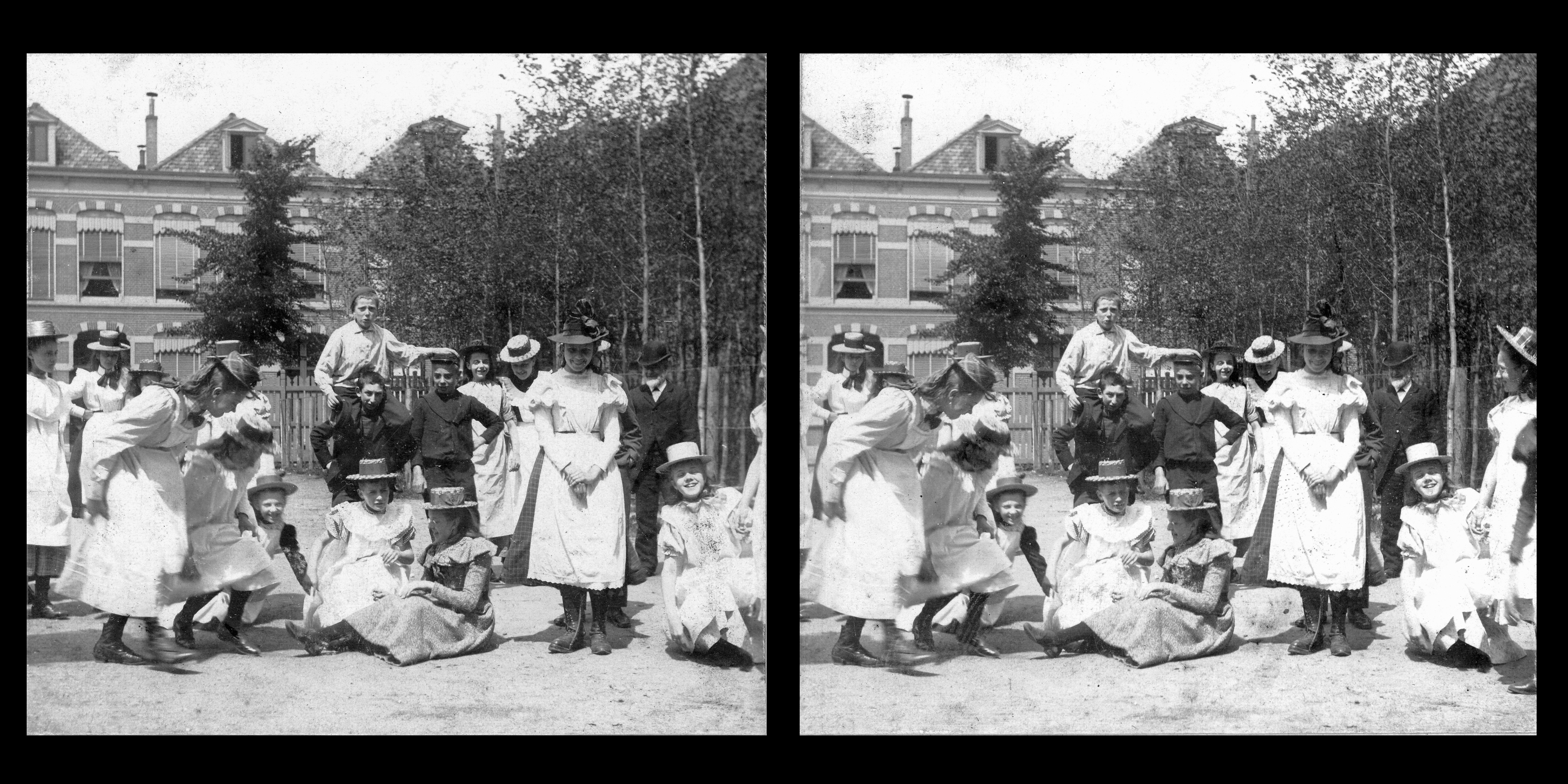 Stereofoto van een groep jeugdigen op het plein van de Burgeravondschool aan het Kromhout.