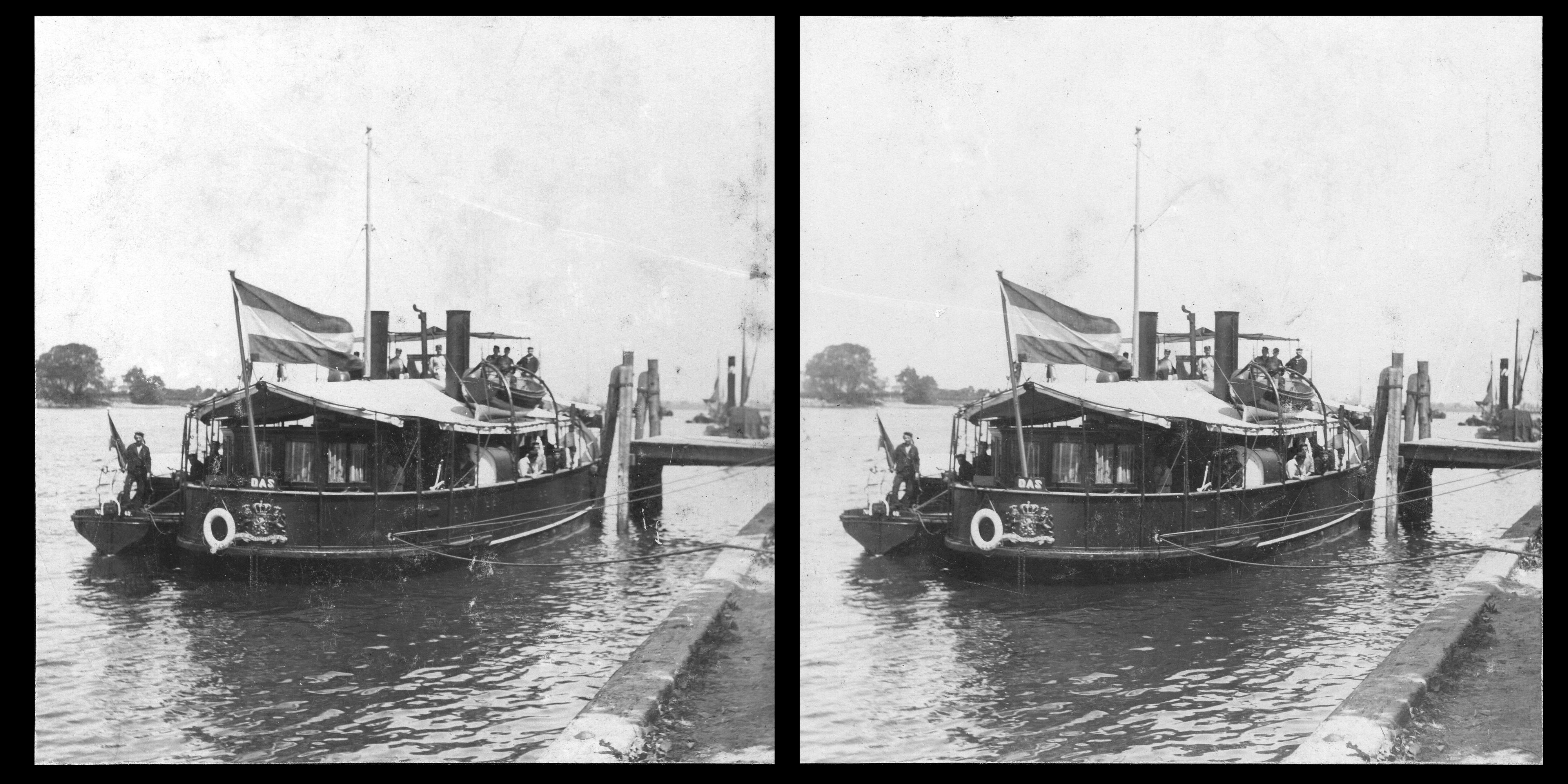 Stereofoto van instructieschip H.M. Das, een kanonneerboot.