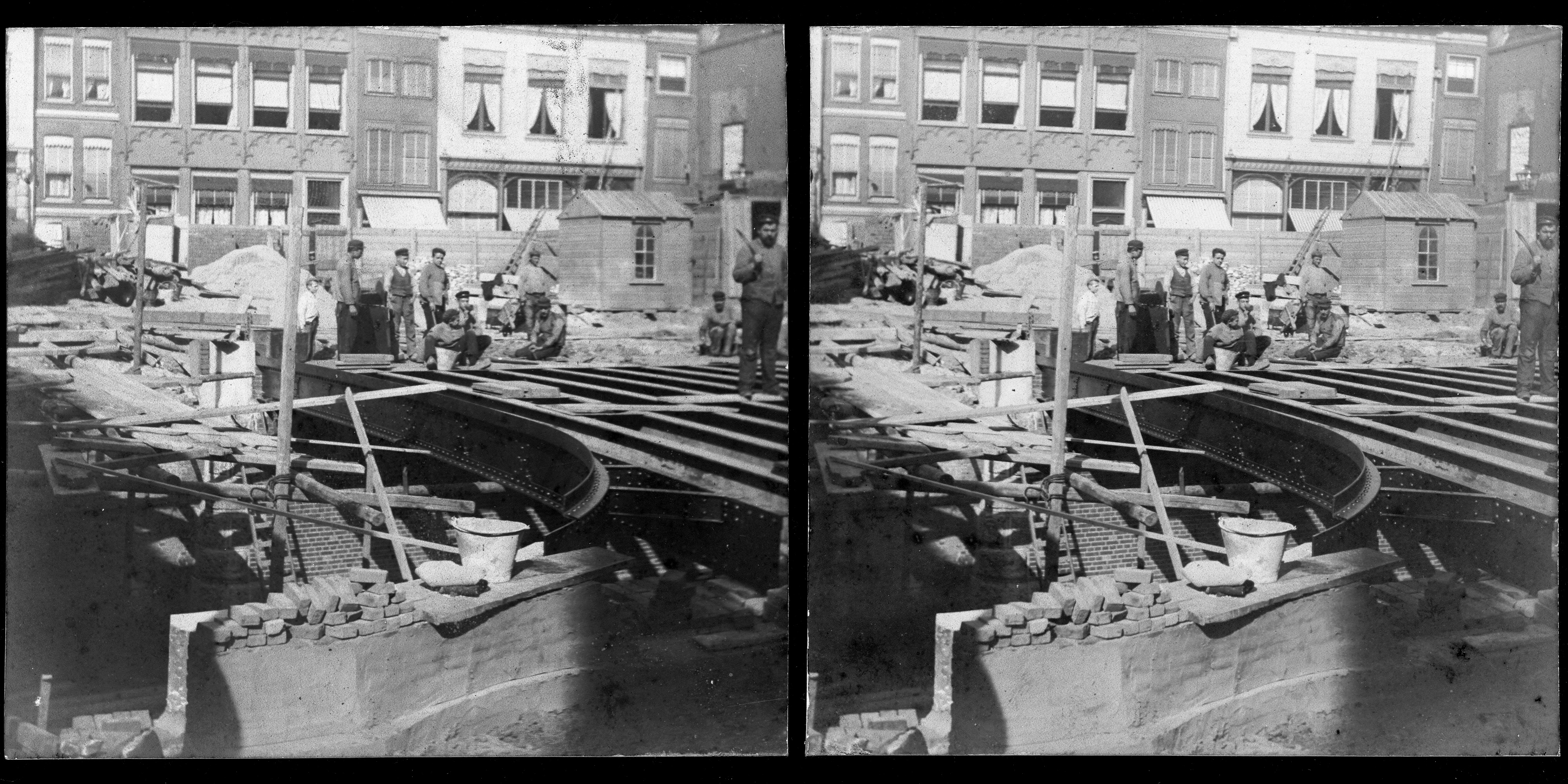 Stereofoto van de verbreding van de Visbrug over de Voorstraatshaven.