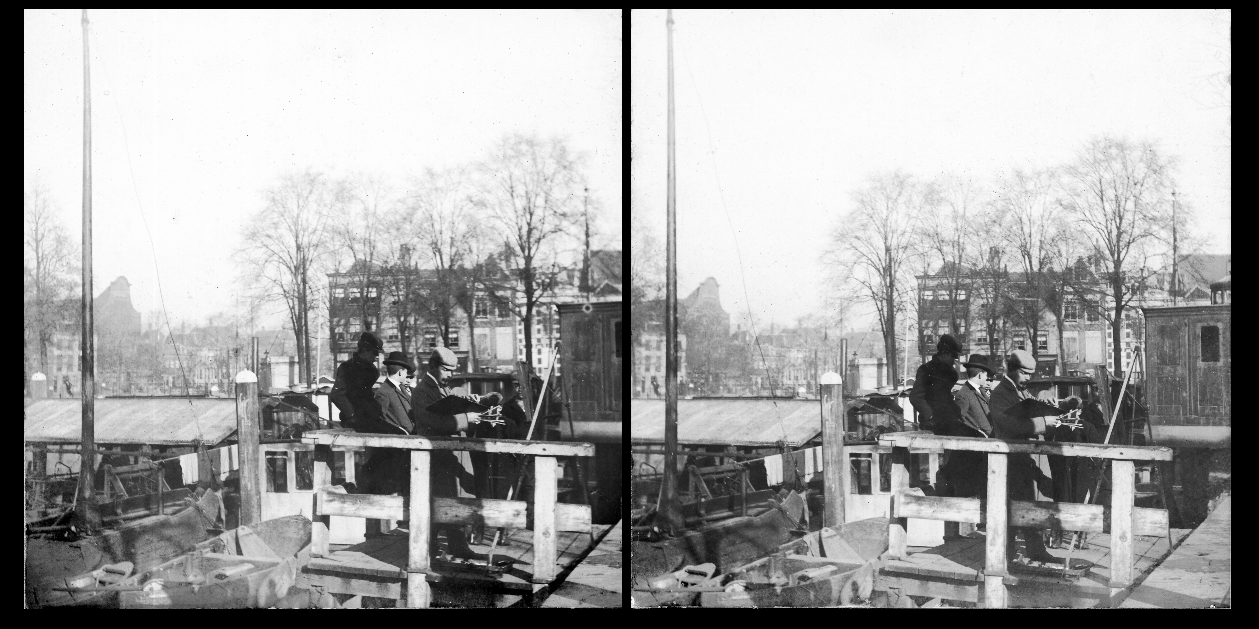 Stereofoto van het visvlot aan de Knolhaven, gezien richting Aardappelmarkt.