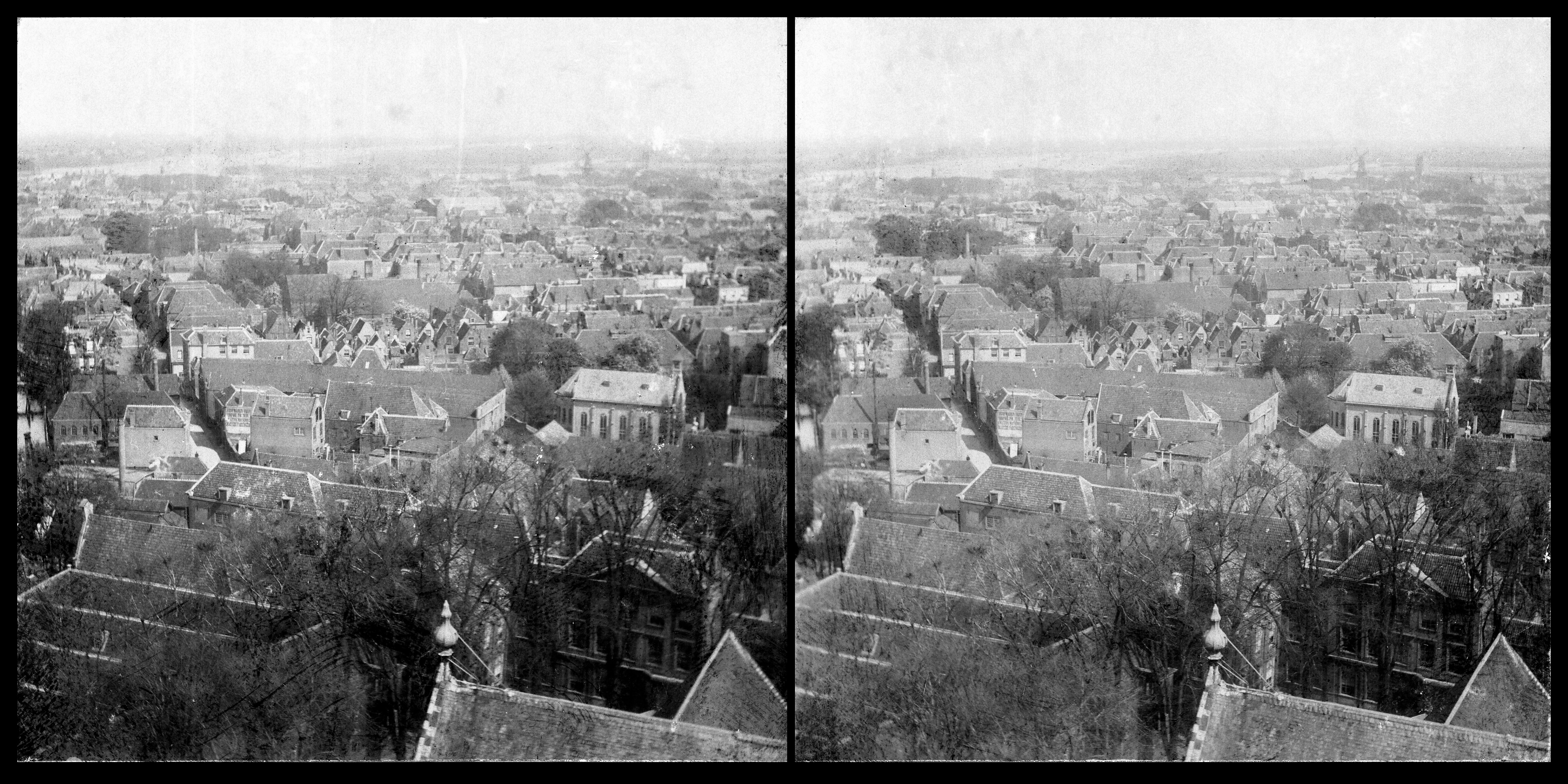 Stereofoto vanaf de Grotekerkstoren naar het noordoosten. Rechts in het midden de …