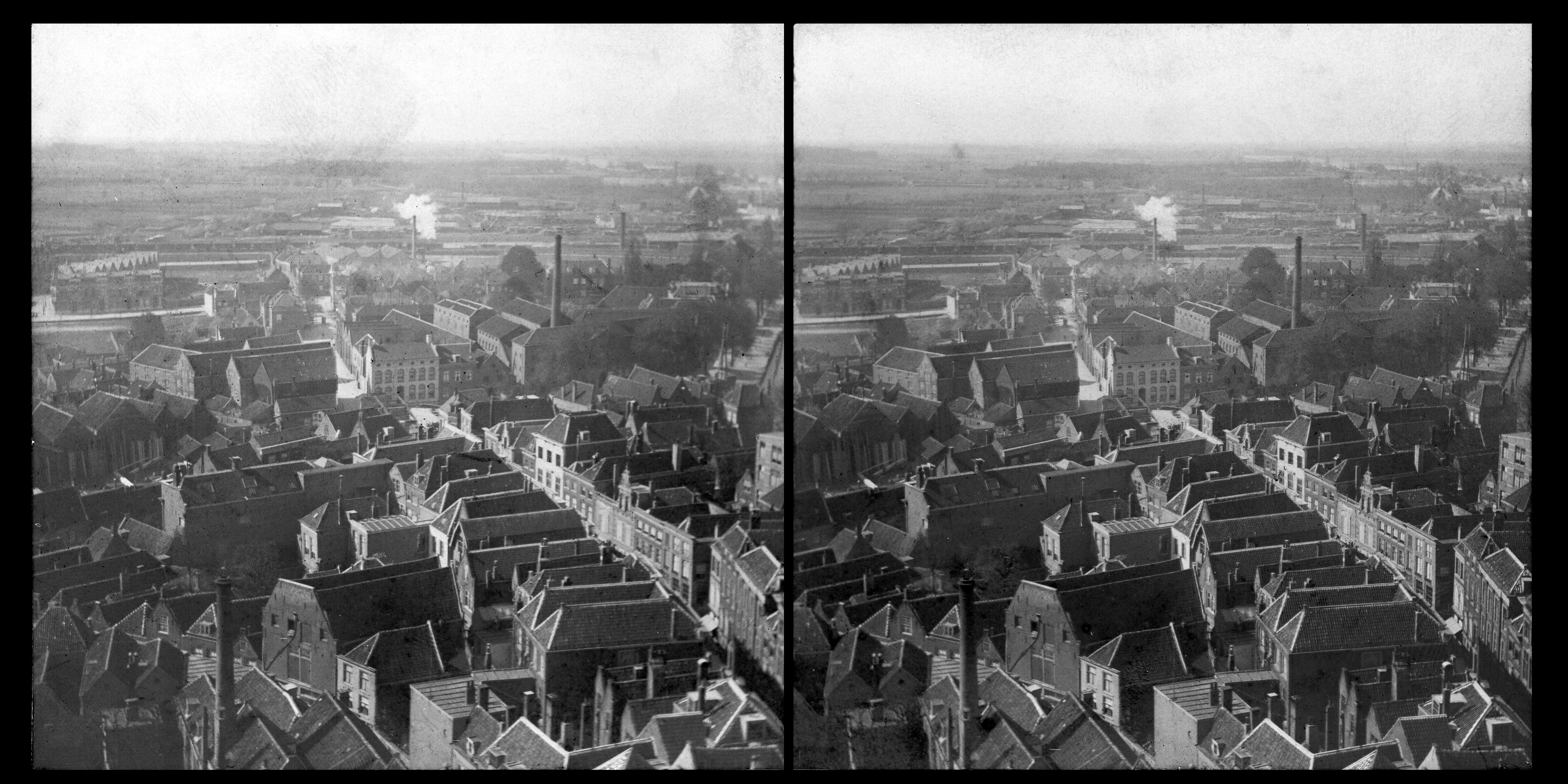 Stereofoto vanaf de Grotekerkstoren over de Suikerstraat (middenonder) richting Achterhakkers. De schoorsteen is van de Dogcakesfabriek. Rechts de Prinsenstraat.