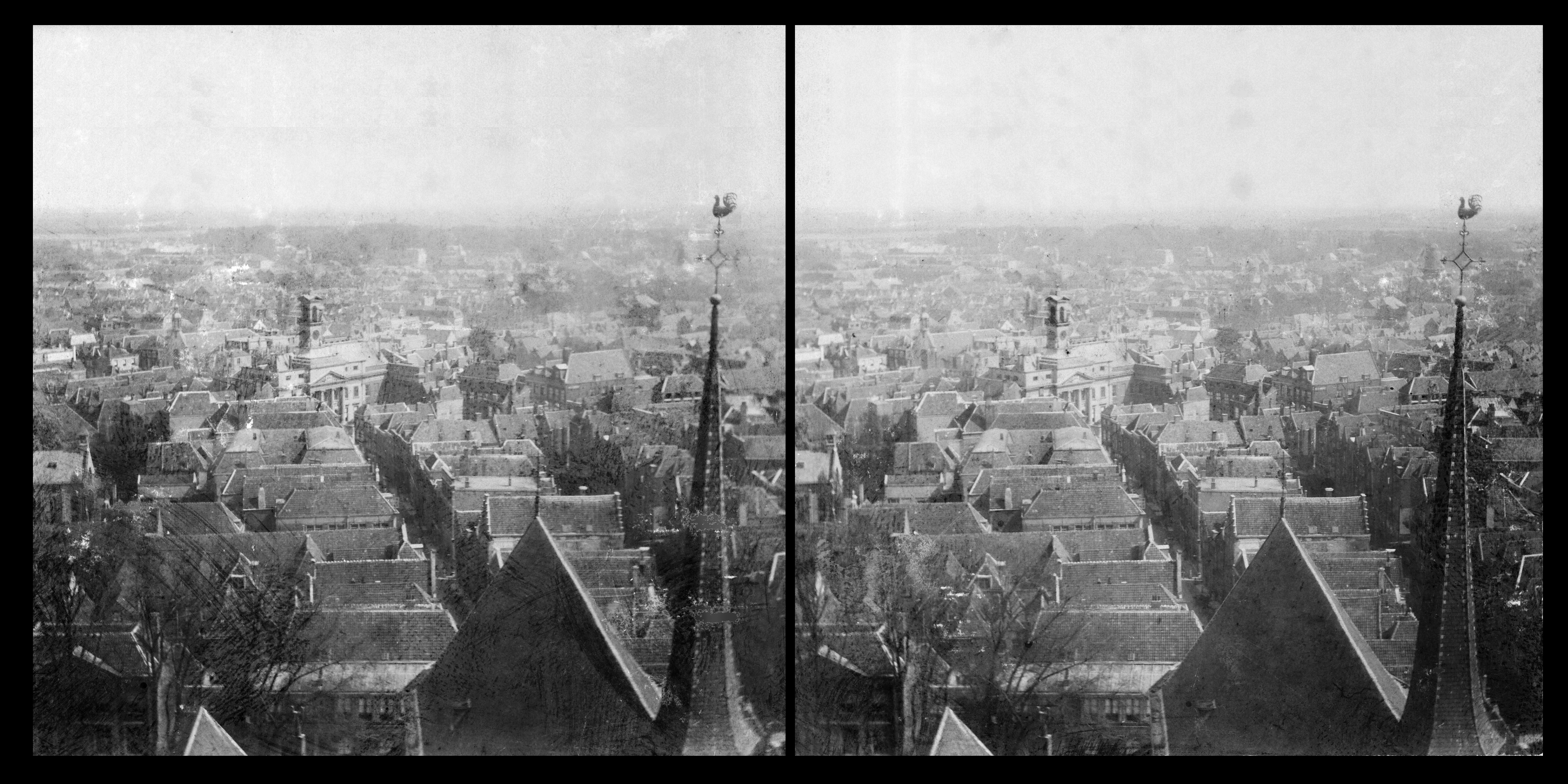 Stereofoto vanaf de toren van de Grote Kerk over de Grotekerksbuurt richting stadhuis.