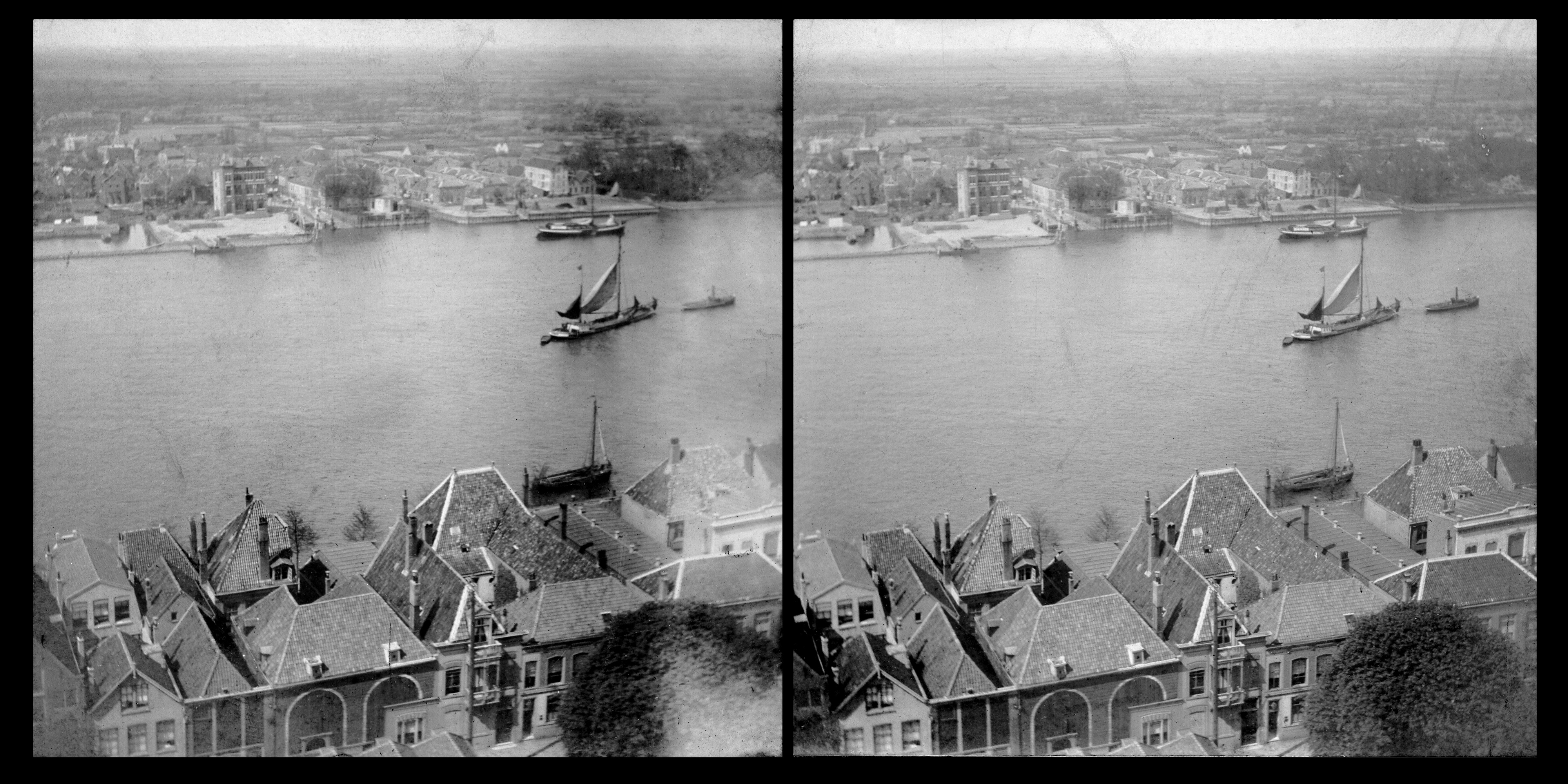 - Stereofoto vanaf de toren van de Grote Kerk over het Maartensgat en de Oude Maas. Links op de achtergrond hotel Het Witte Paard in Zwijndrecht.