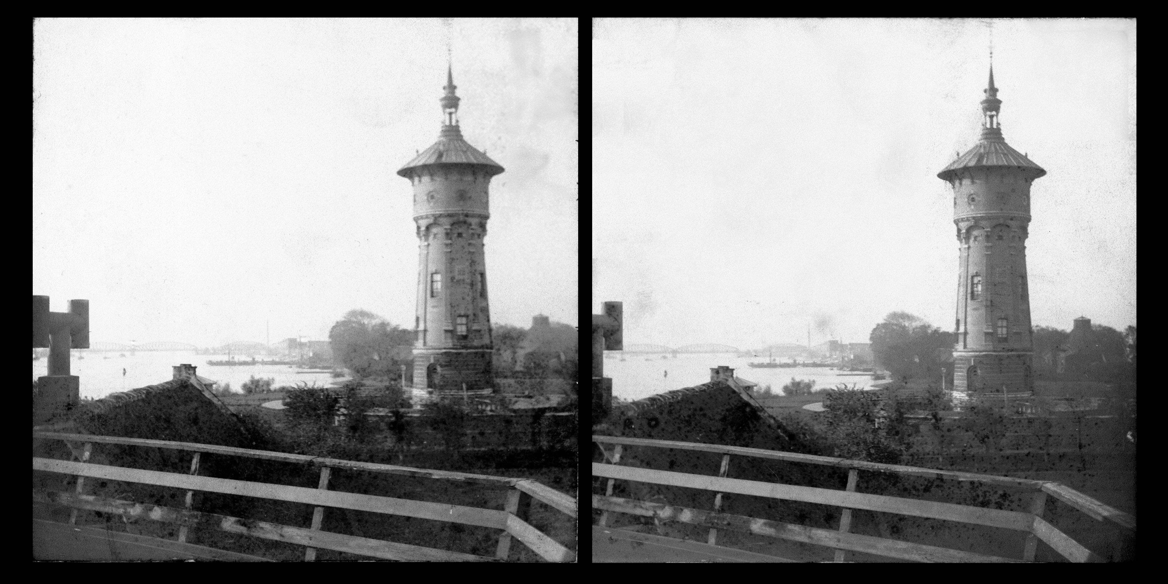 - Stereofoto vanaf de gaanderij van molen Weltevreden op de Oude Maas en de watertoren in Zwijndrecht.