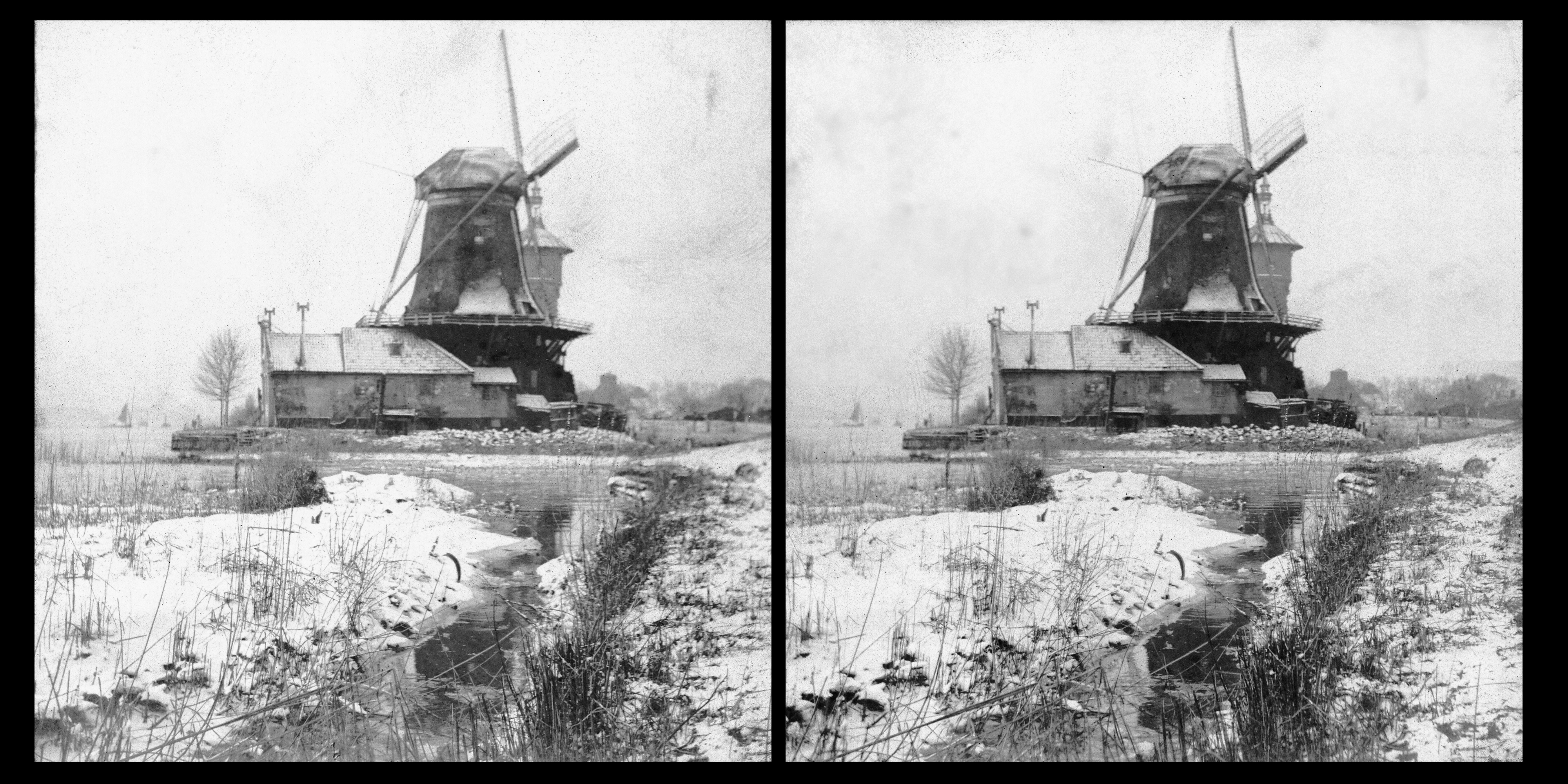 Stereofoto van molen Welgelegen - ook Weltevrede(n) genoemd - en daarachter de …