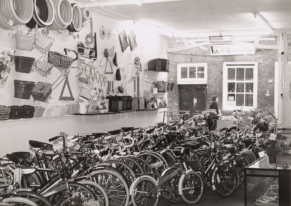Interieur van rijwielhandel Olree - Minnaard in de Vriesestraat.