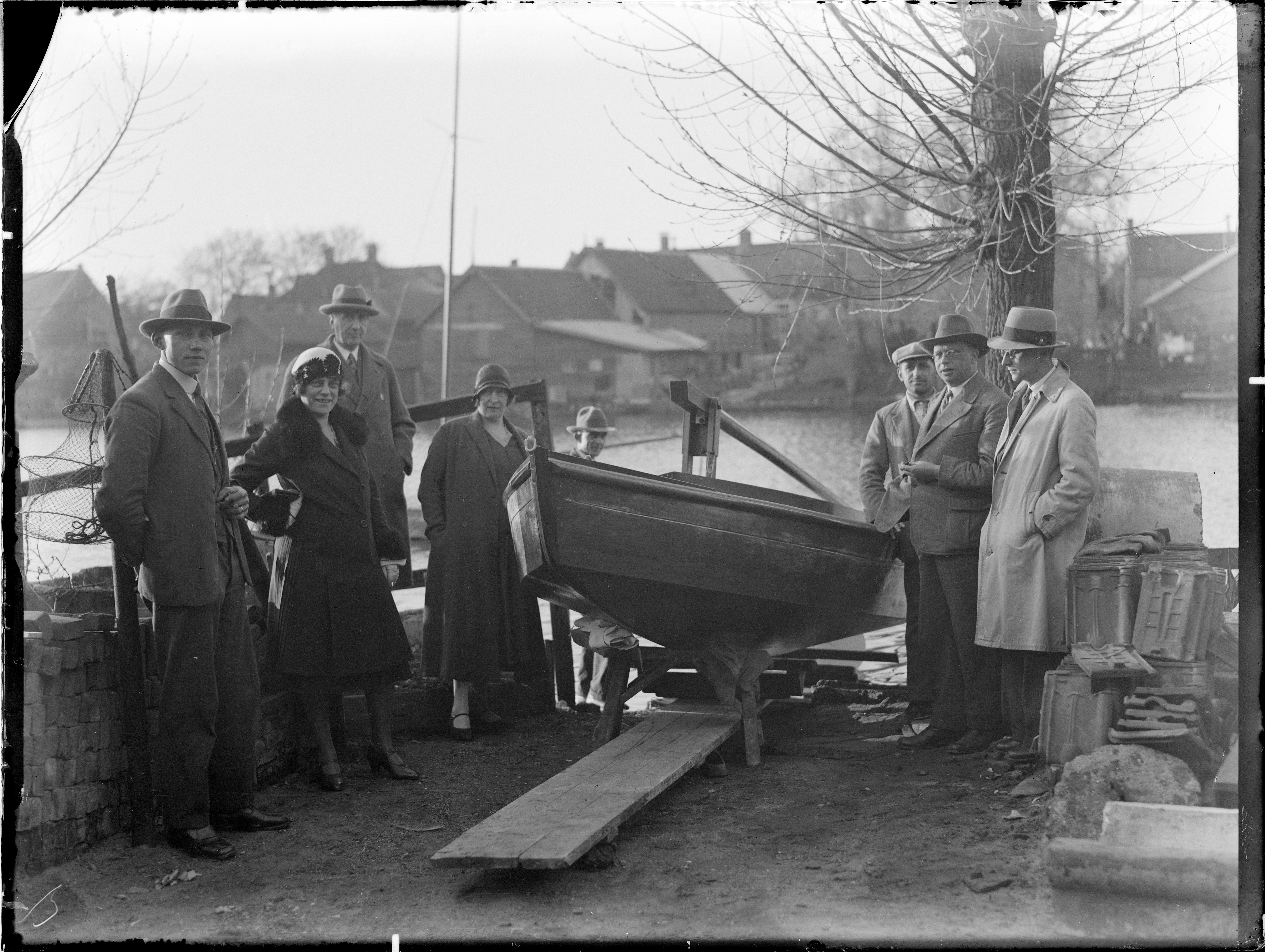 - De tewaterlating van een zeilboot in de Polderstraat langs de Alblas in Alblasserdam. Links Jan van Opijnen, de tweede man van rechts is ir. Willem Vrijlandt, leraar aan de MTS te Dordrecht.